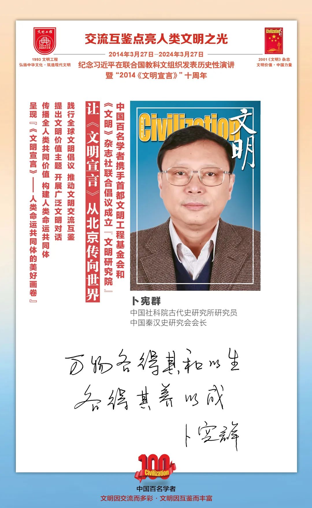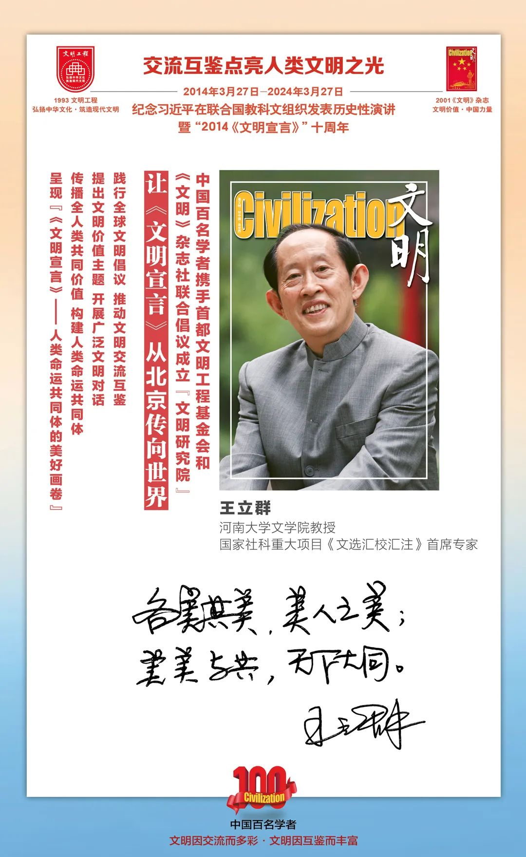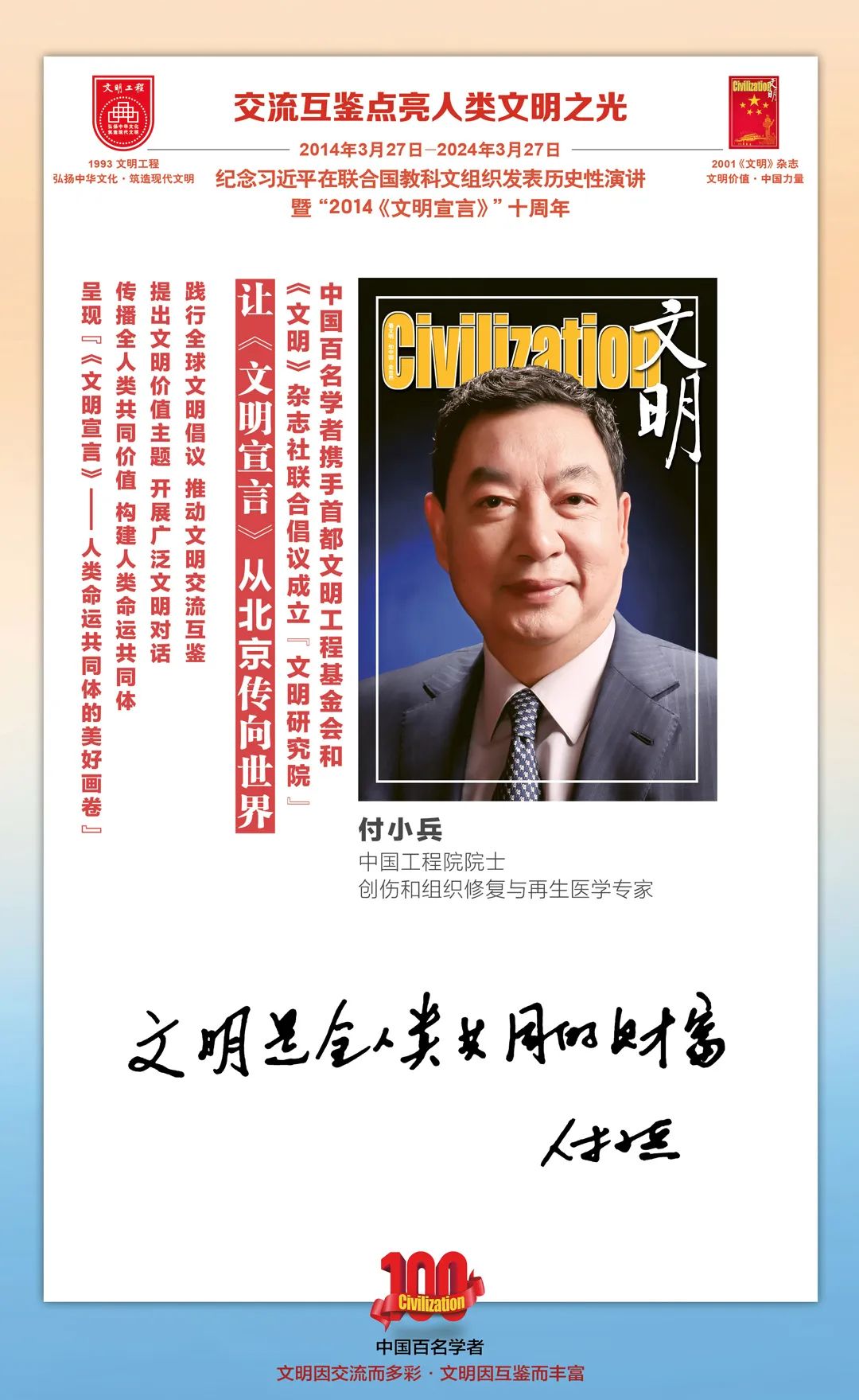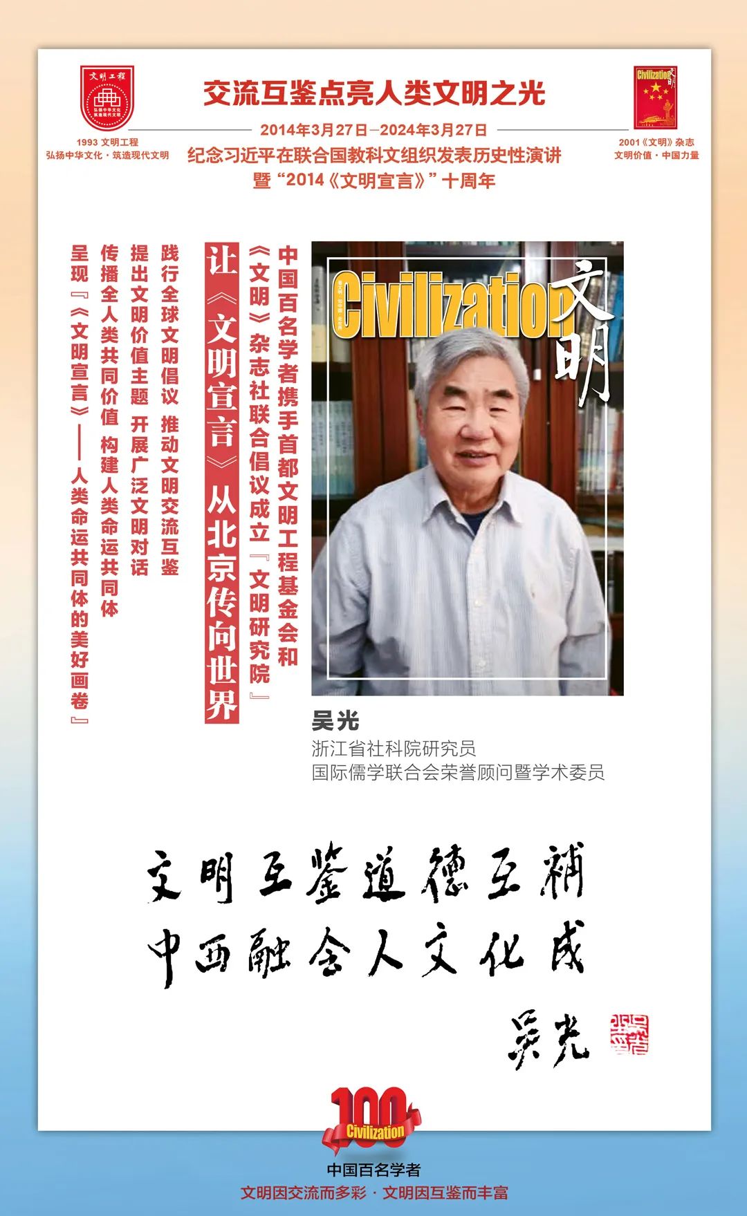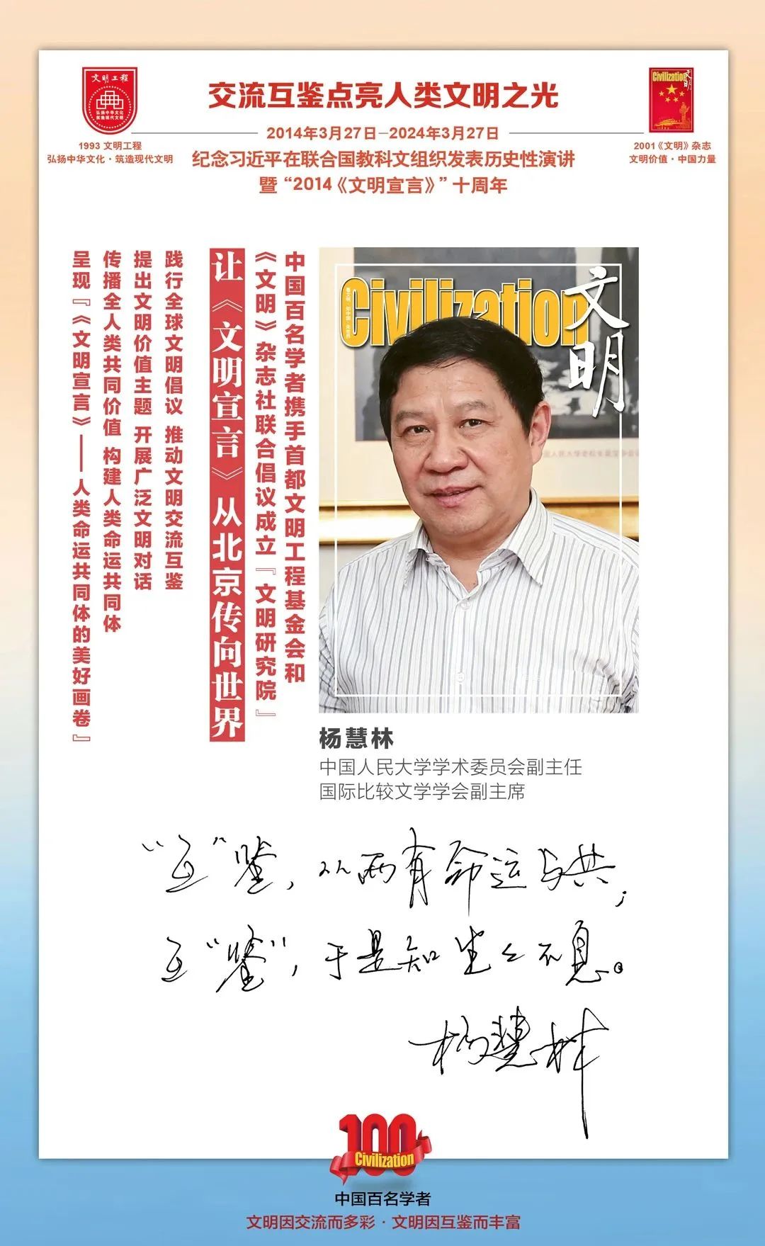 2014-2024,纪念2014《文明宣言》发表10周年,中国百名学者携手首都文明工程基金会和《文明》杂志社联合倡议。让《文明宣言》从北京传向世界,文明交流互鉴促进世界文明发展。