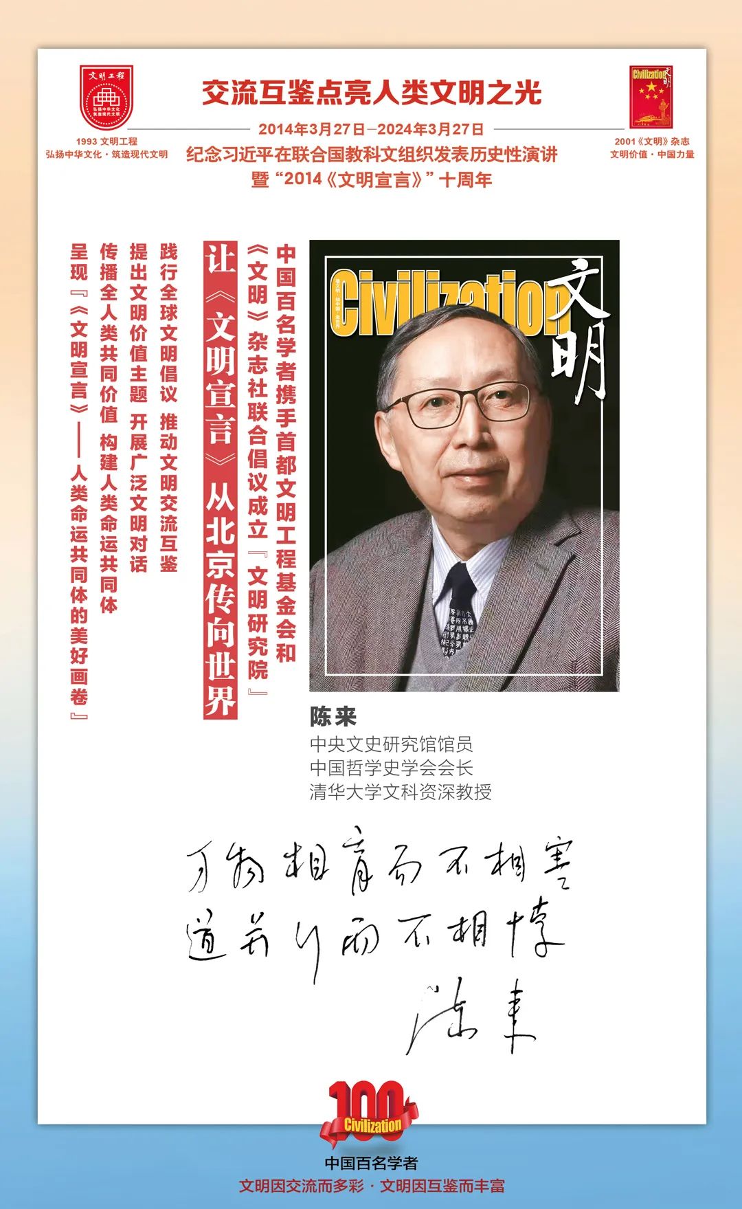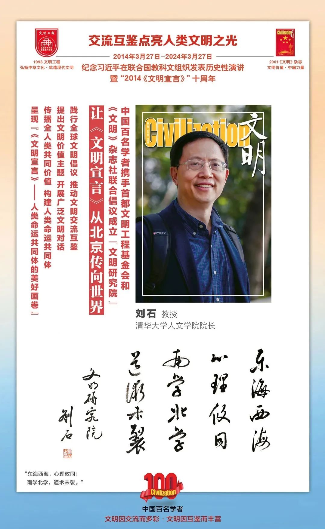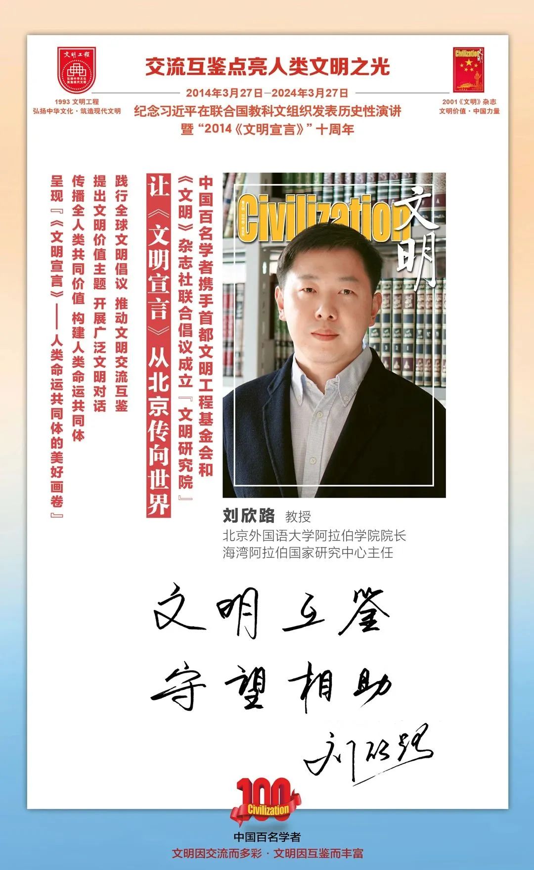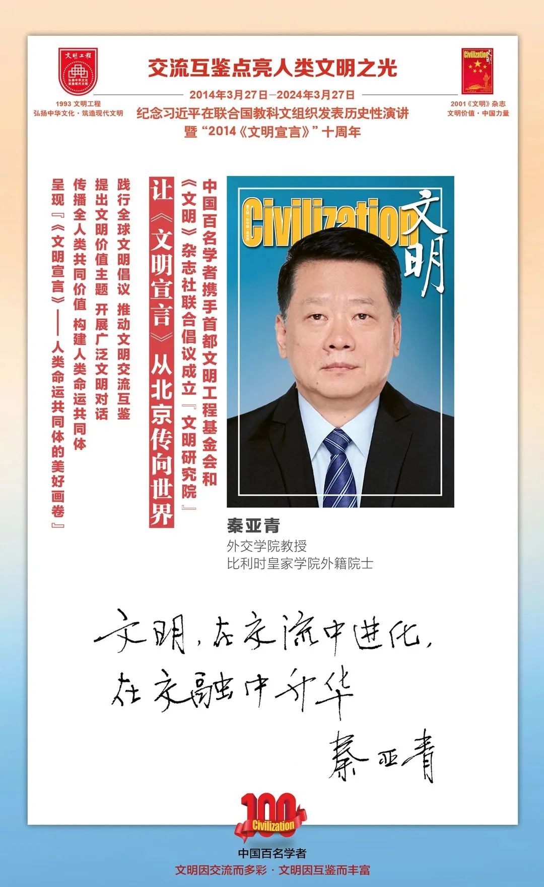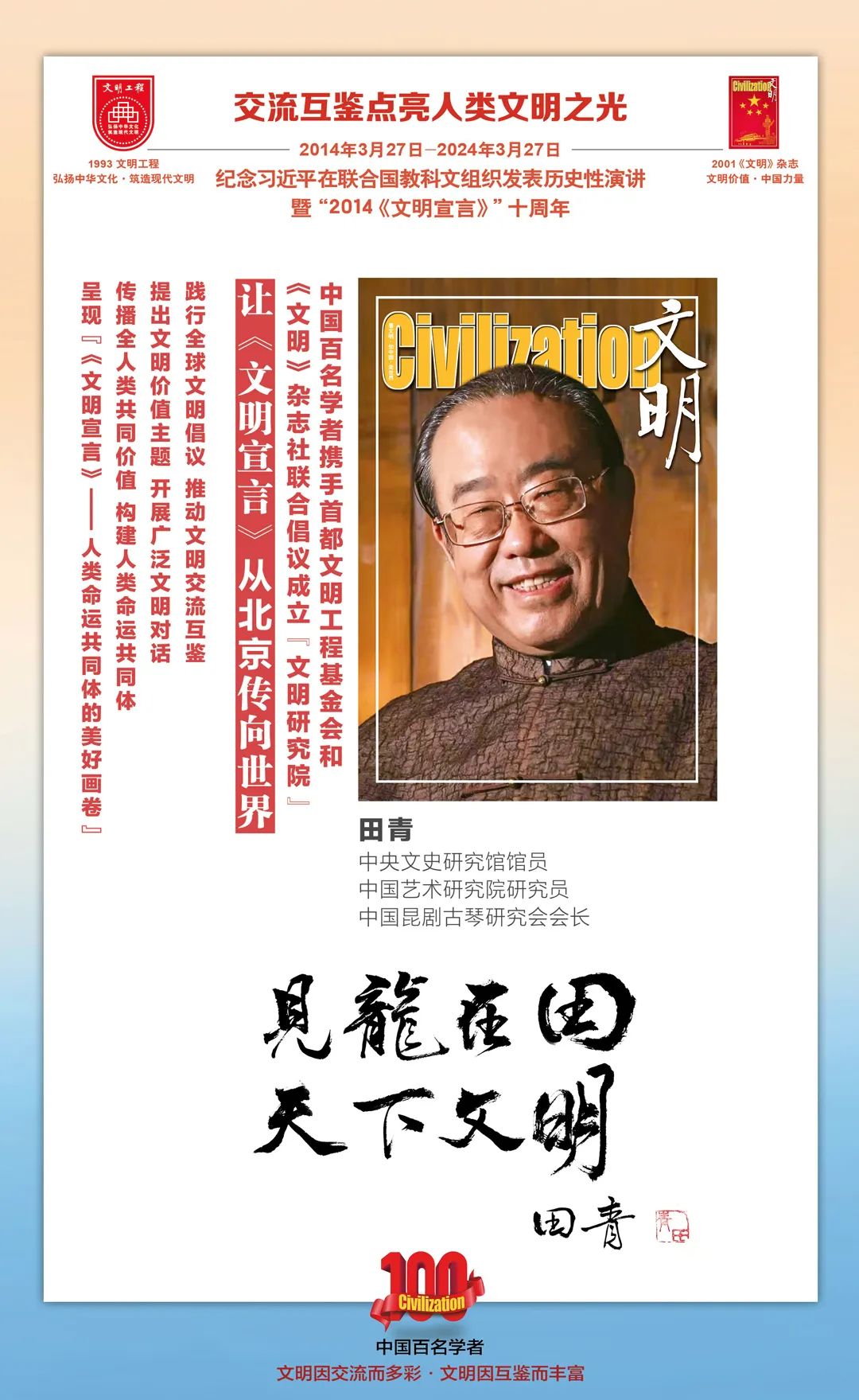 2014-2024,纪念2014《文明宣言》发表10周年,中国百名学者携手首都文明工程基金会和《文明》杂志社联合倡议。让《文明宣言》从北京传向世界,文明交流互鉴促进世界文明发展。