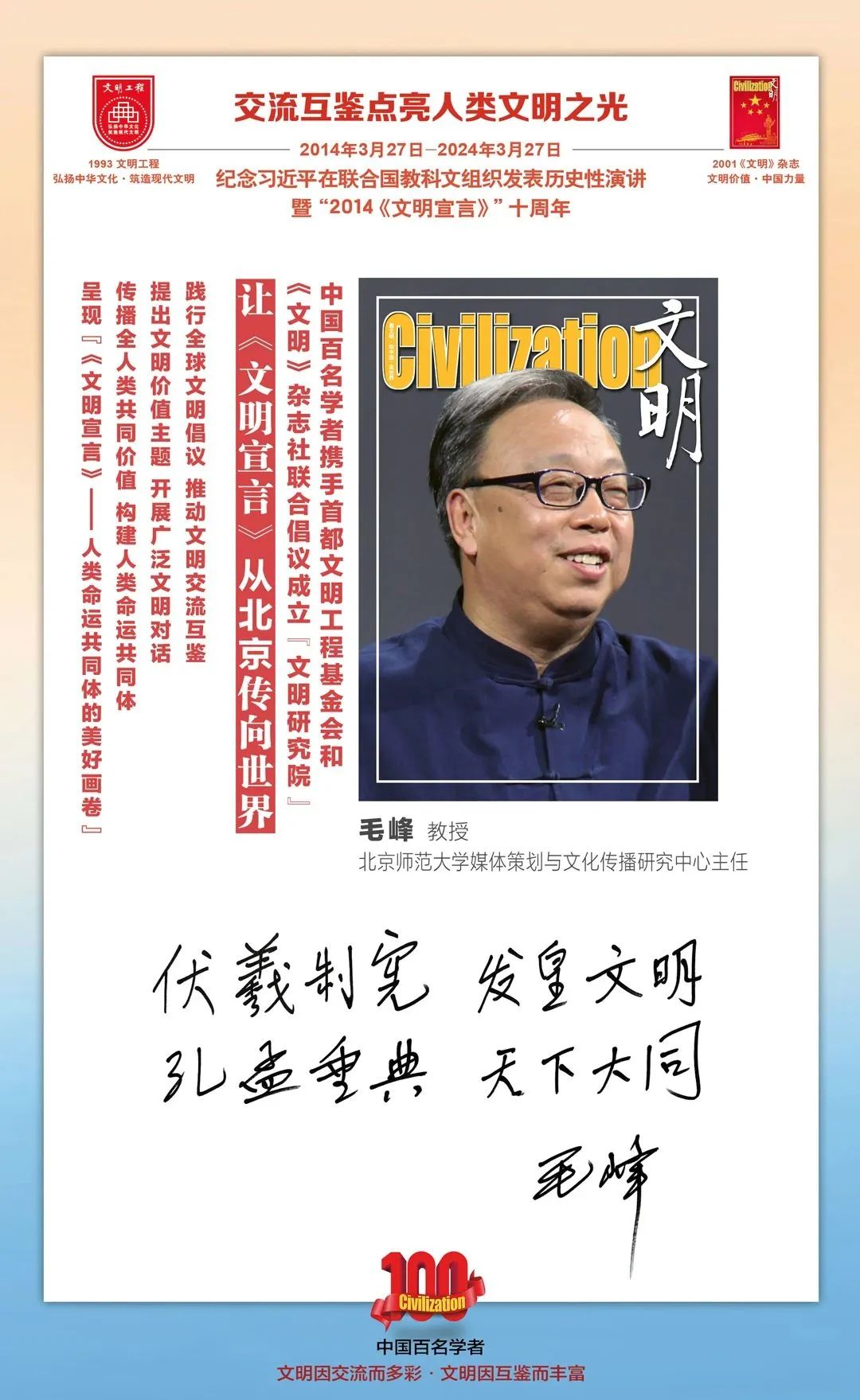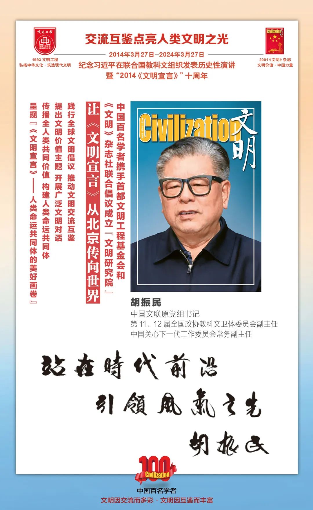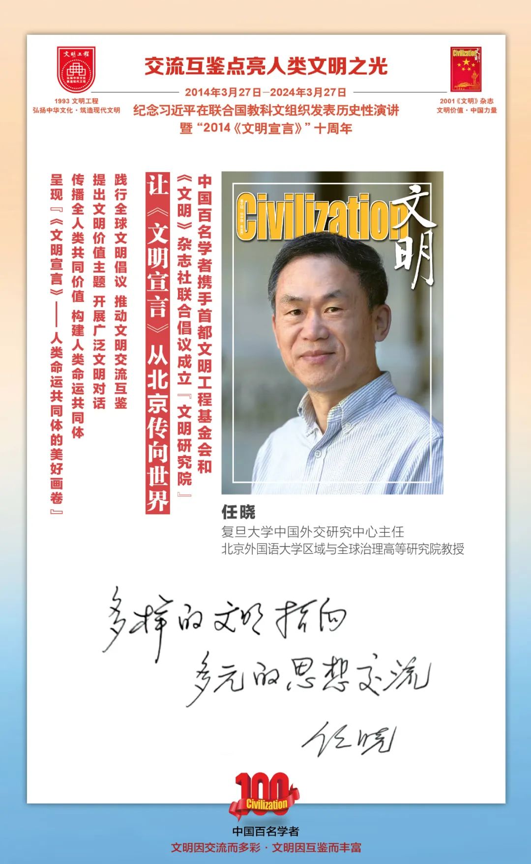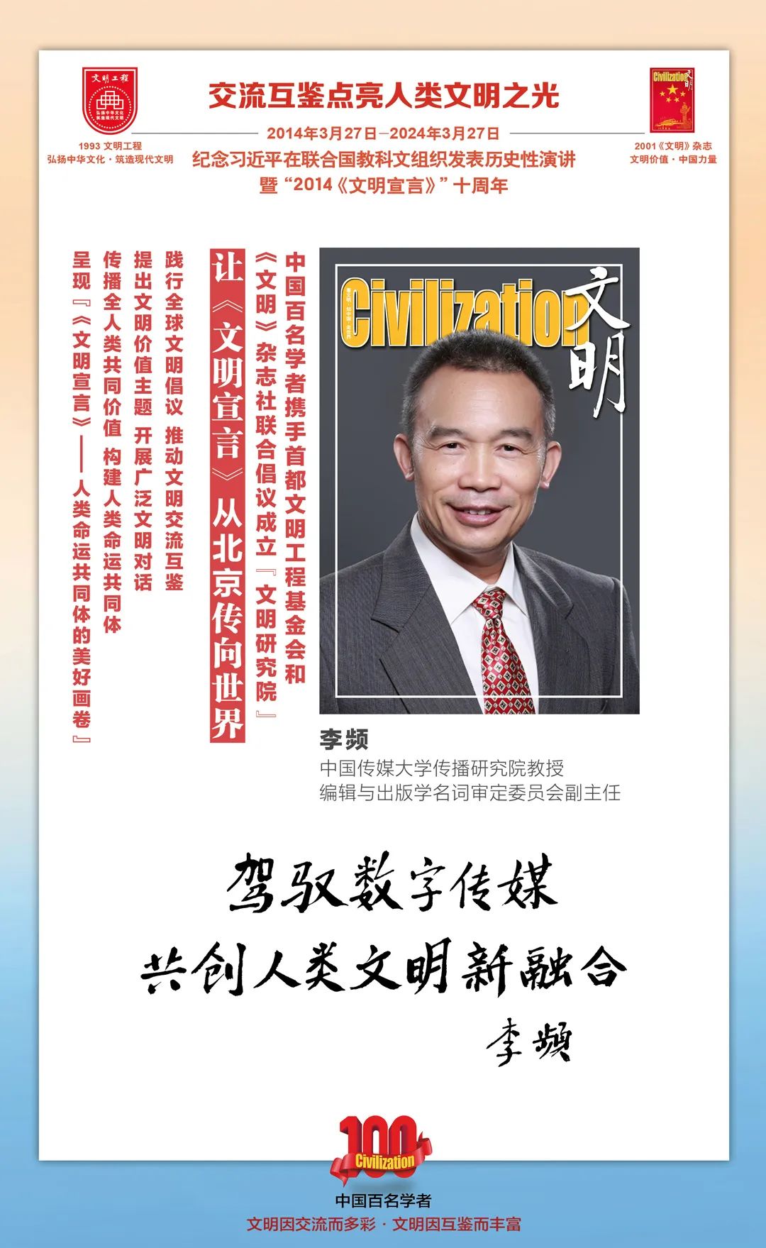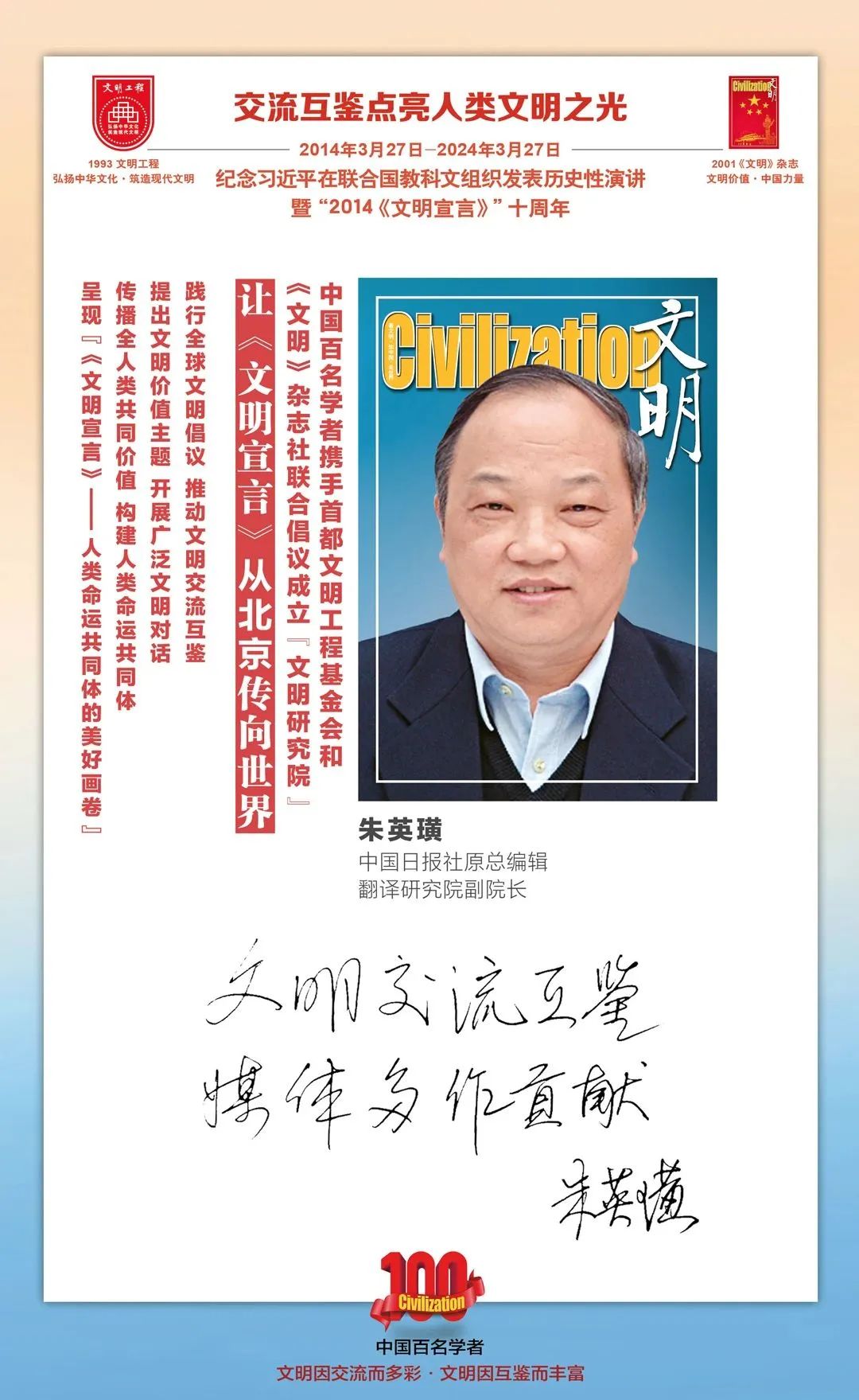 2014-2024,纪念2014《文明宣言》发表10周年,中国百名学者携手首都文明工程基金会和《文明》杂志社联合倡议。让《文明宣言》从北京传向世界,文明交流互鉴促进世界文明发展。