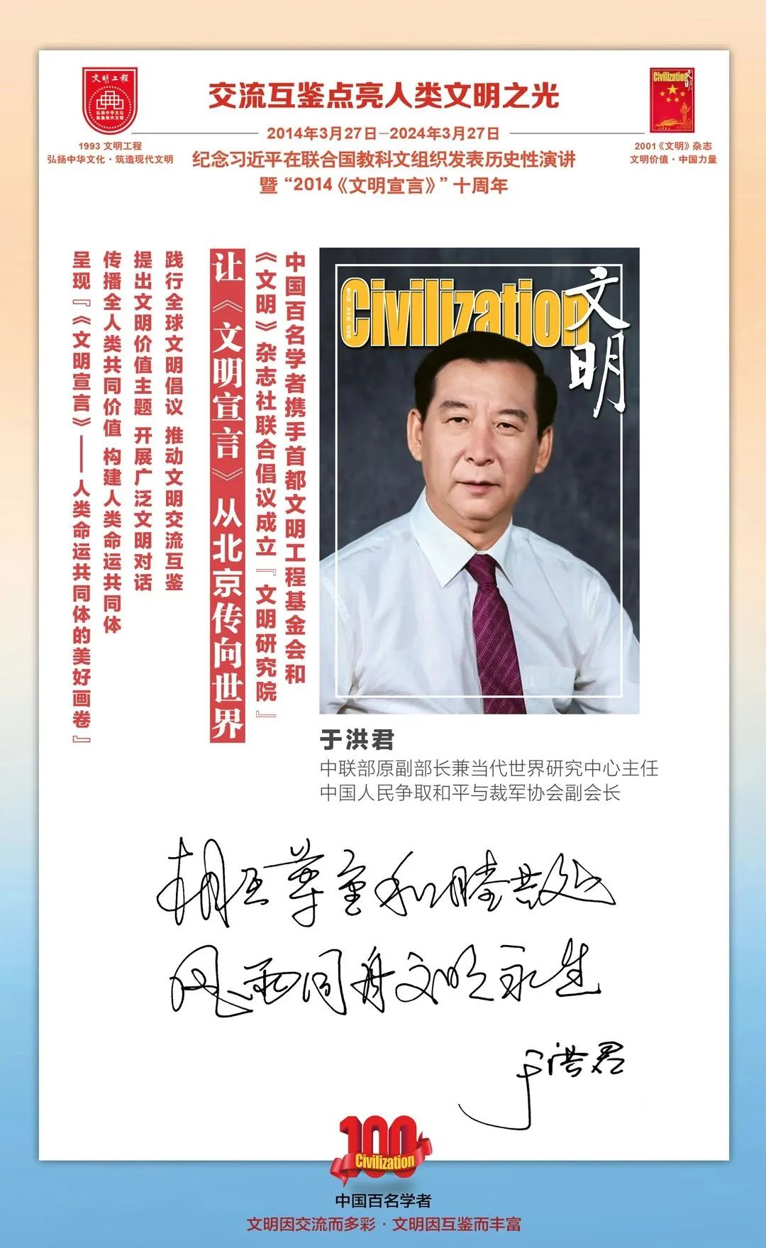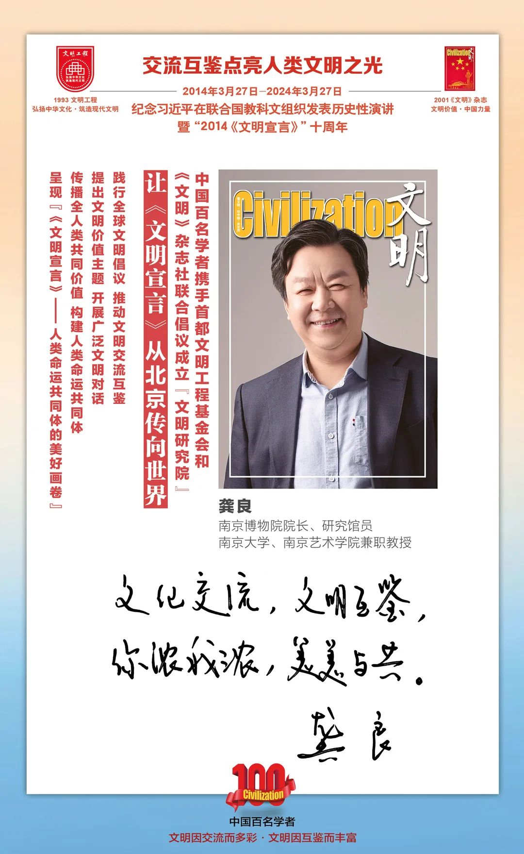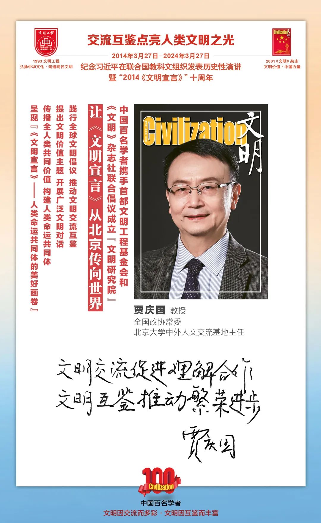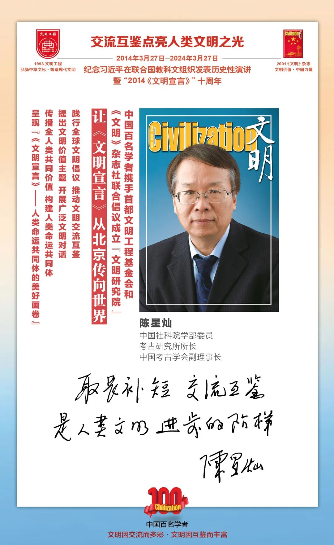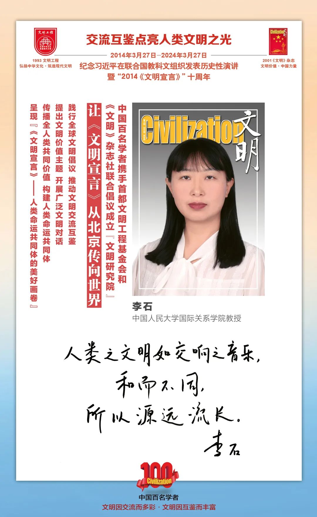 2014-2024,纪念2014《文明宣言》发表10周年,中国百名学者携手首都文明工程基金会和《文明》杂志社联合倡议。让《文明宣言》从北京传向世界,文明交流互鉴促进世界文明发展。