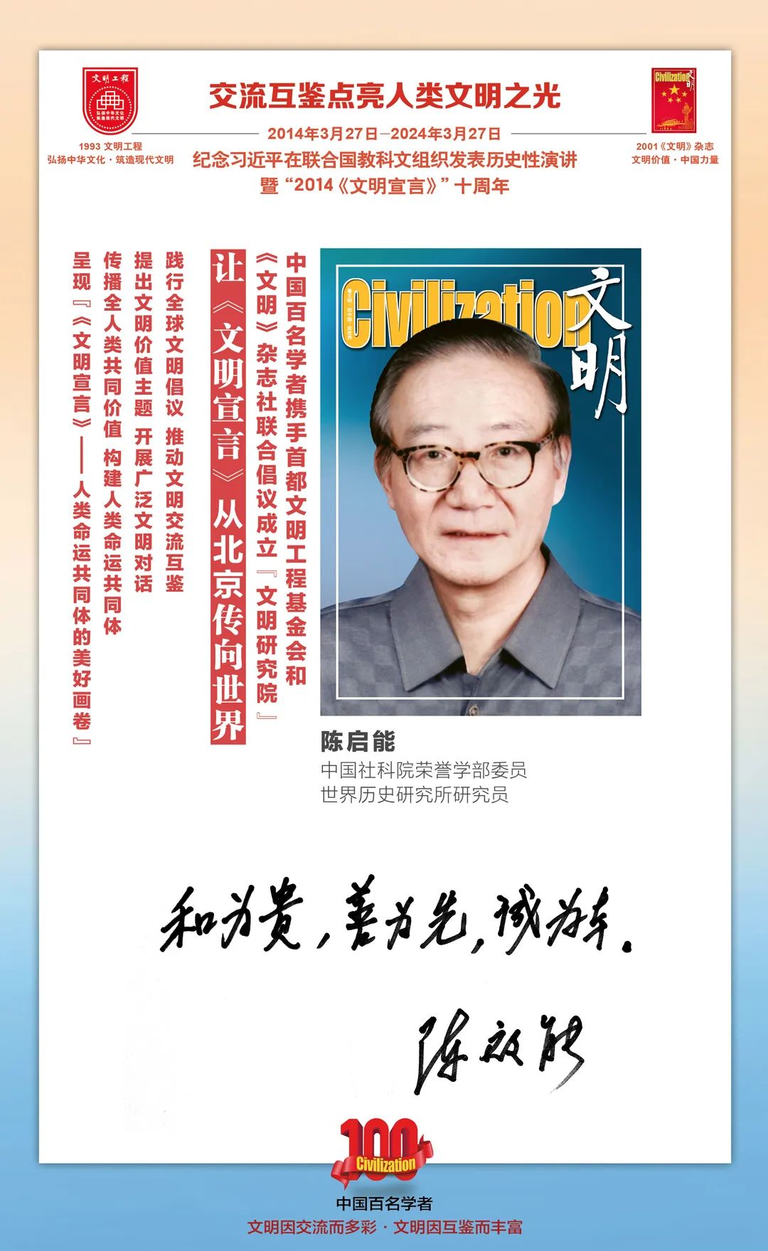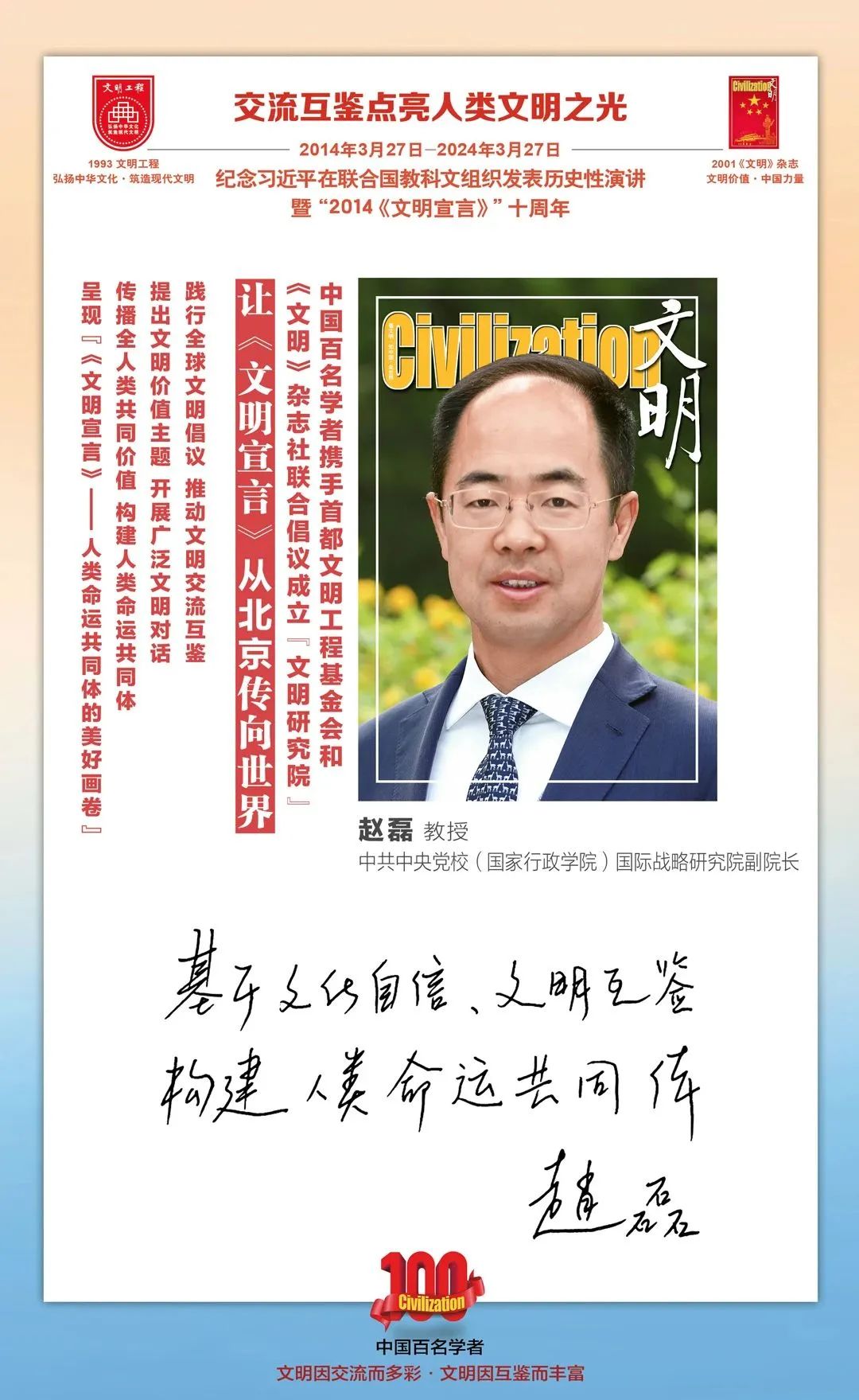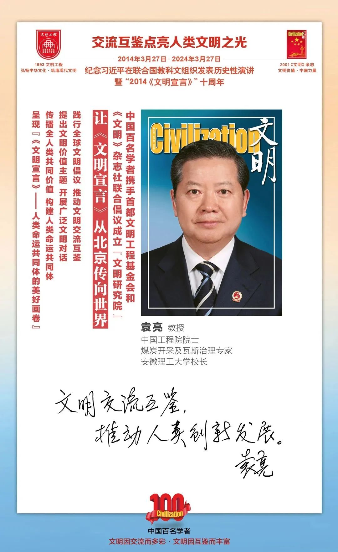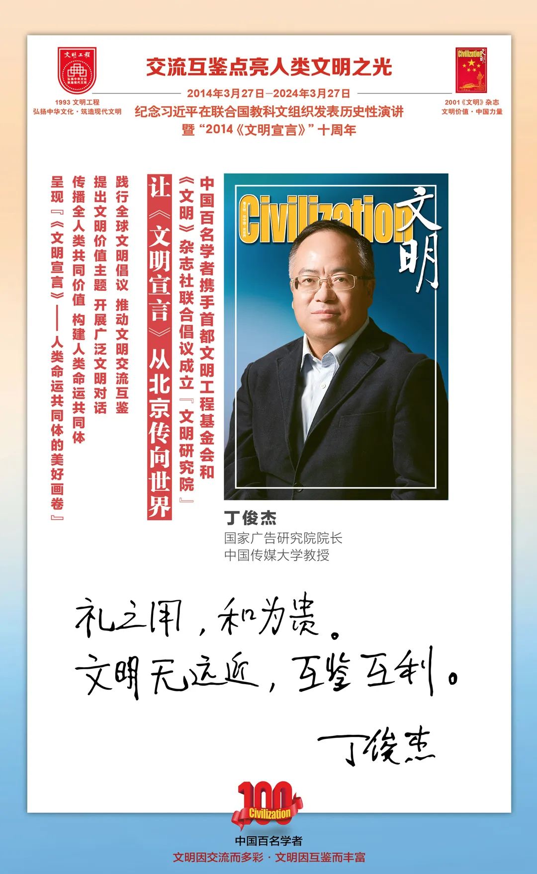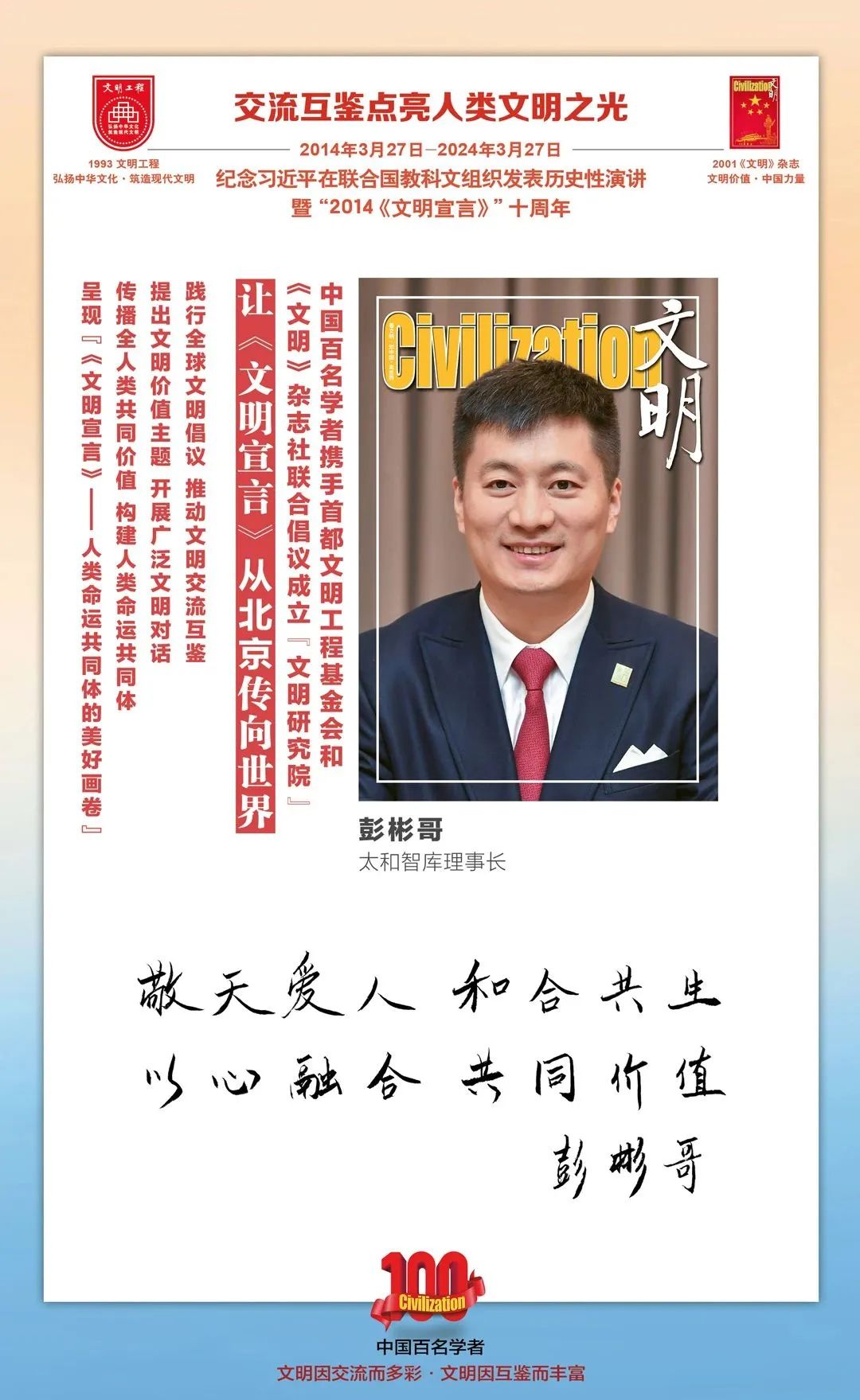 2014-2024,纪念2014《文明宣言》发表10周年,中国百名学者携手首都文明工程基金会和《文明》杂志社联合倡议。让《文明宣言》从北京传向世界,文明交流互鉴促进世界文明发展。