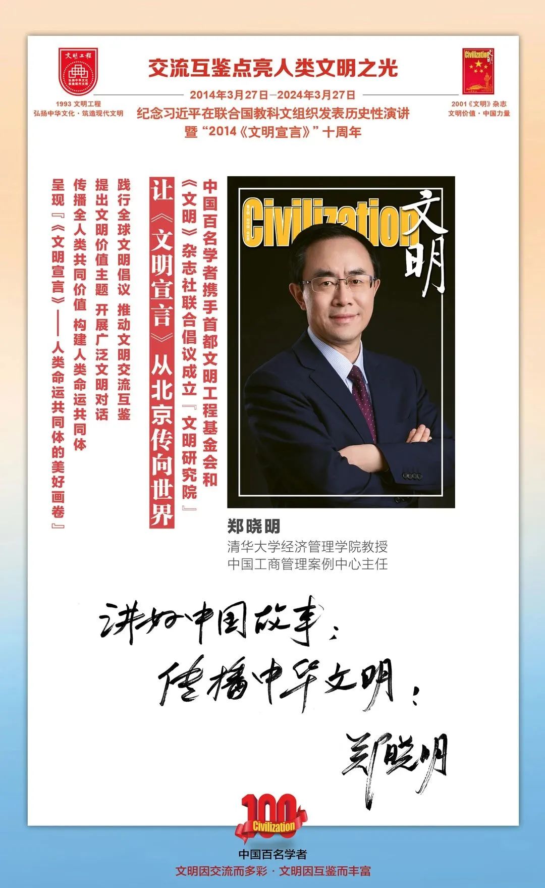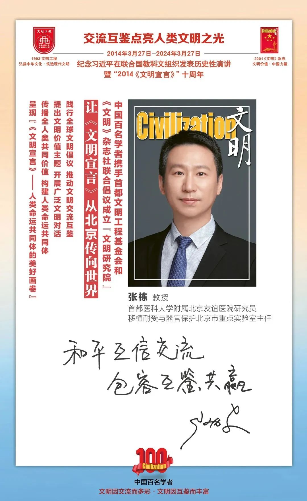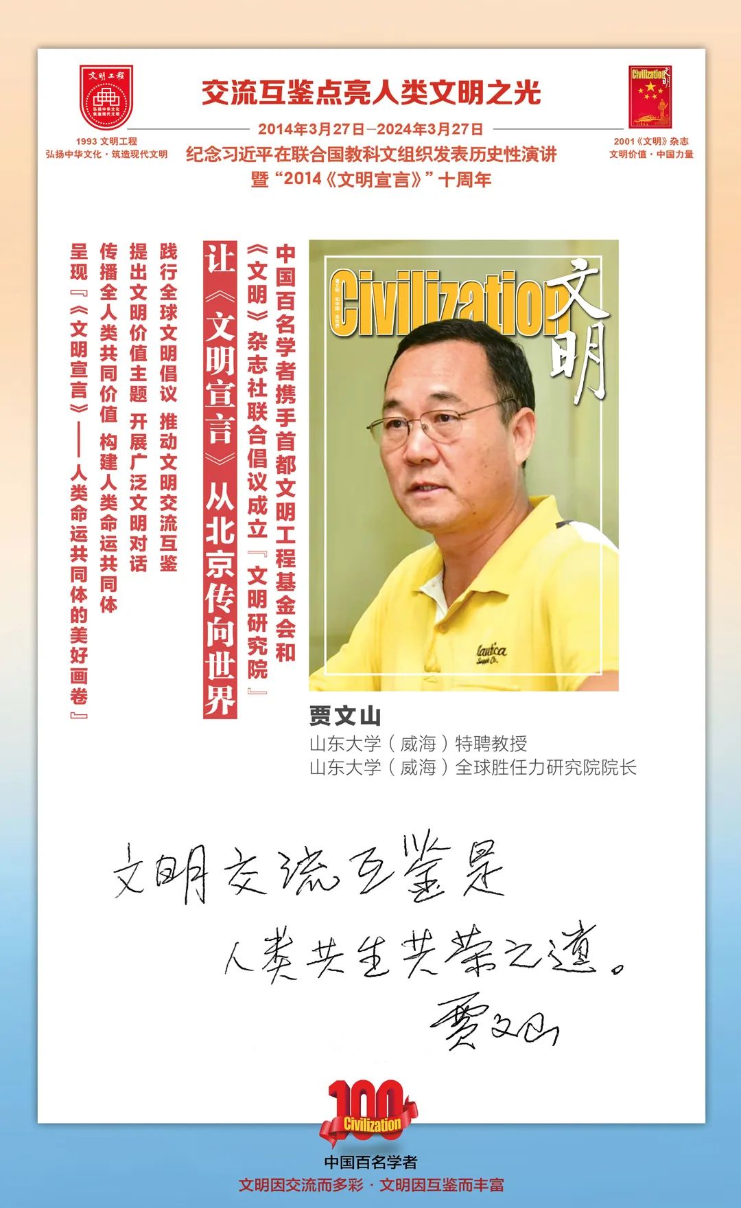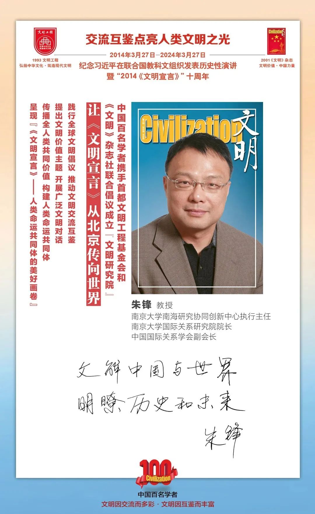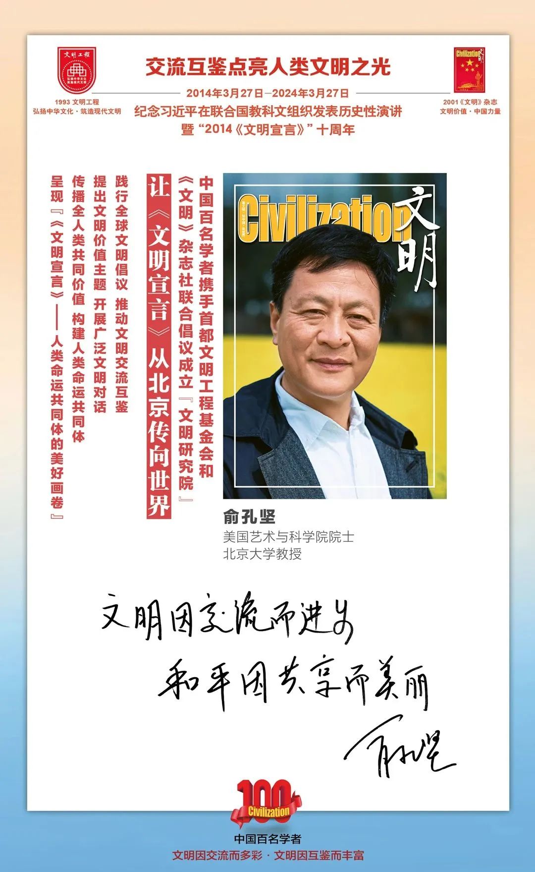 2014-2024,纪念2014《文明宣言》发表10周年,中国百名学者携手首都文明工程基金会和《文明》杂志社联合倡议。让《文明宣言》从北京传向世界,文明交流互鉴促进世界文明发展。