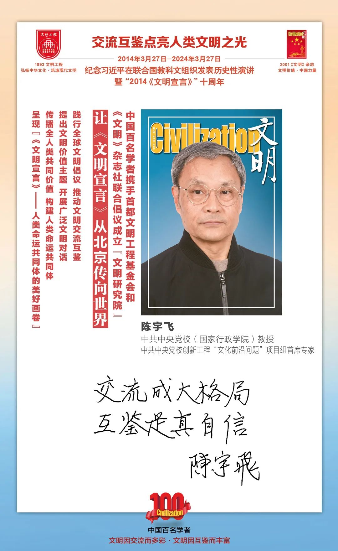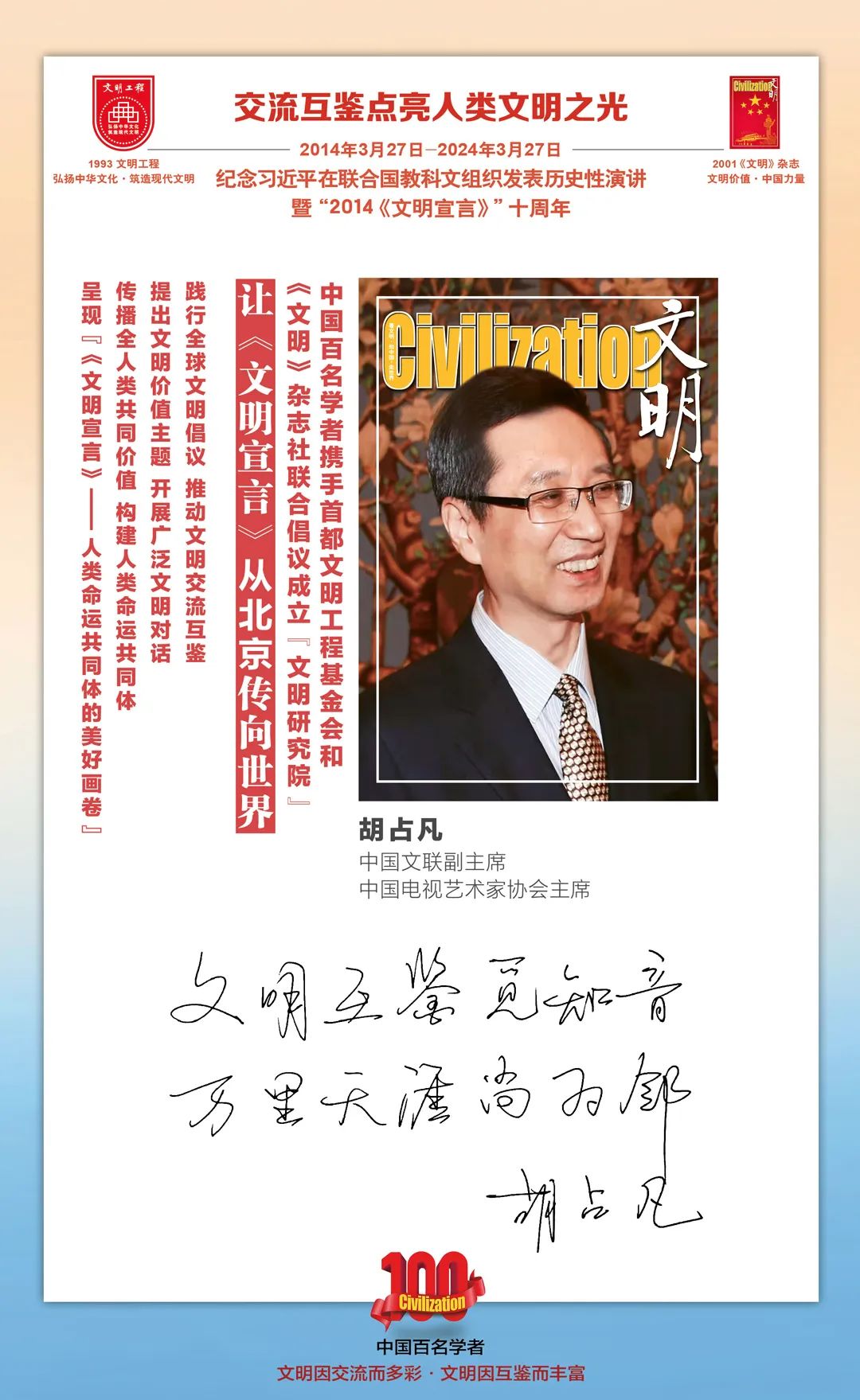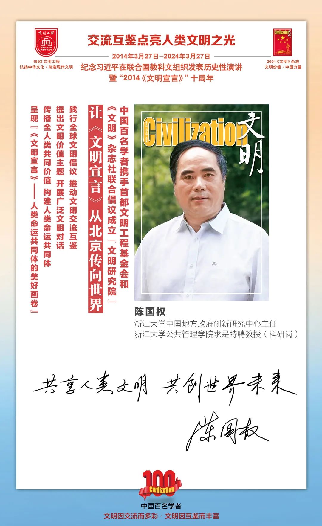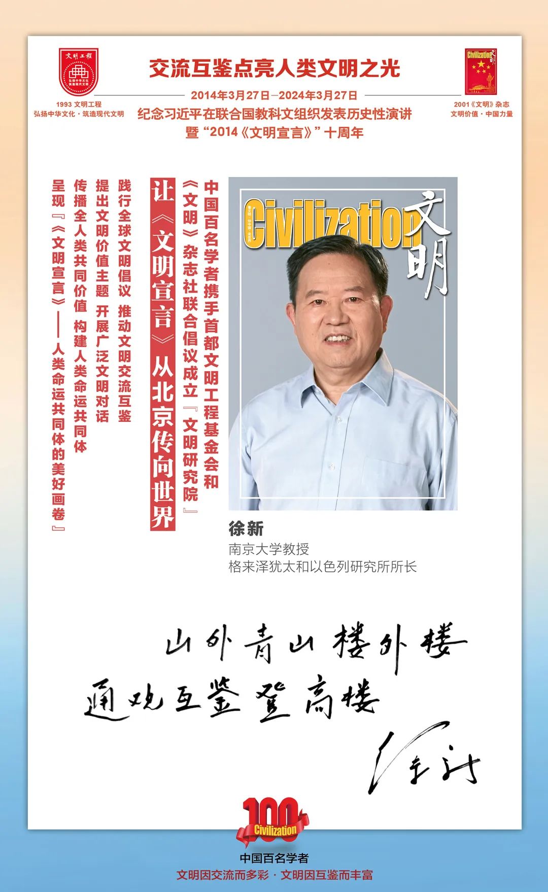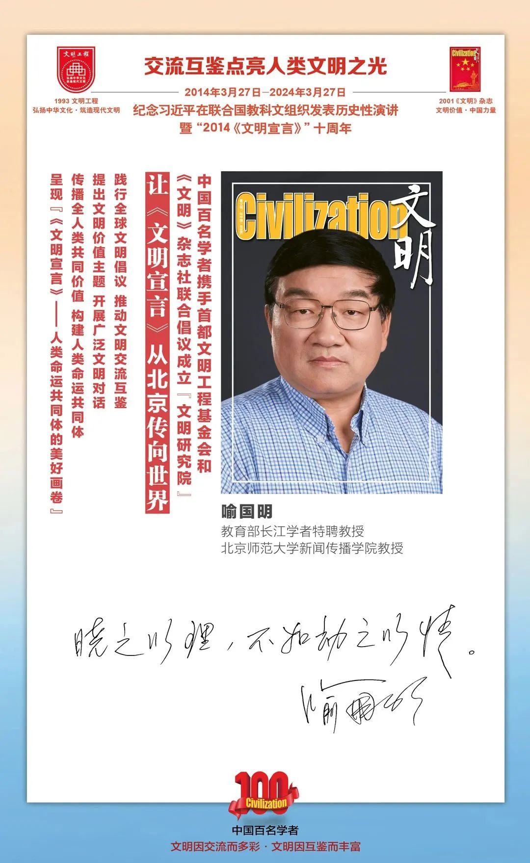 2014-2024,纪念2014《文明宣言》发表10周年,中国百名学者携手首都文明工程基金会和《文明》杂志社联合倡议。让《文明宣言》从北京传向世界,文明交流互鉴促进世界文明发展。