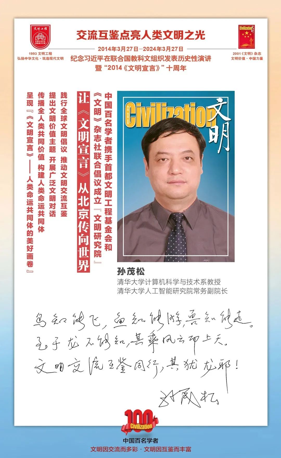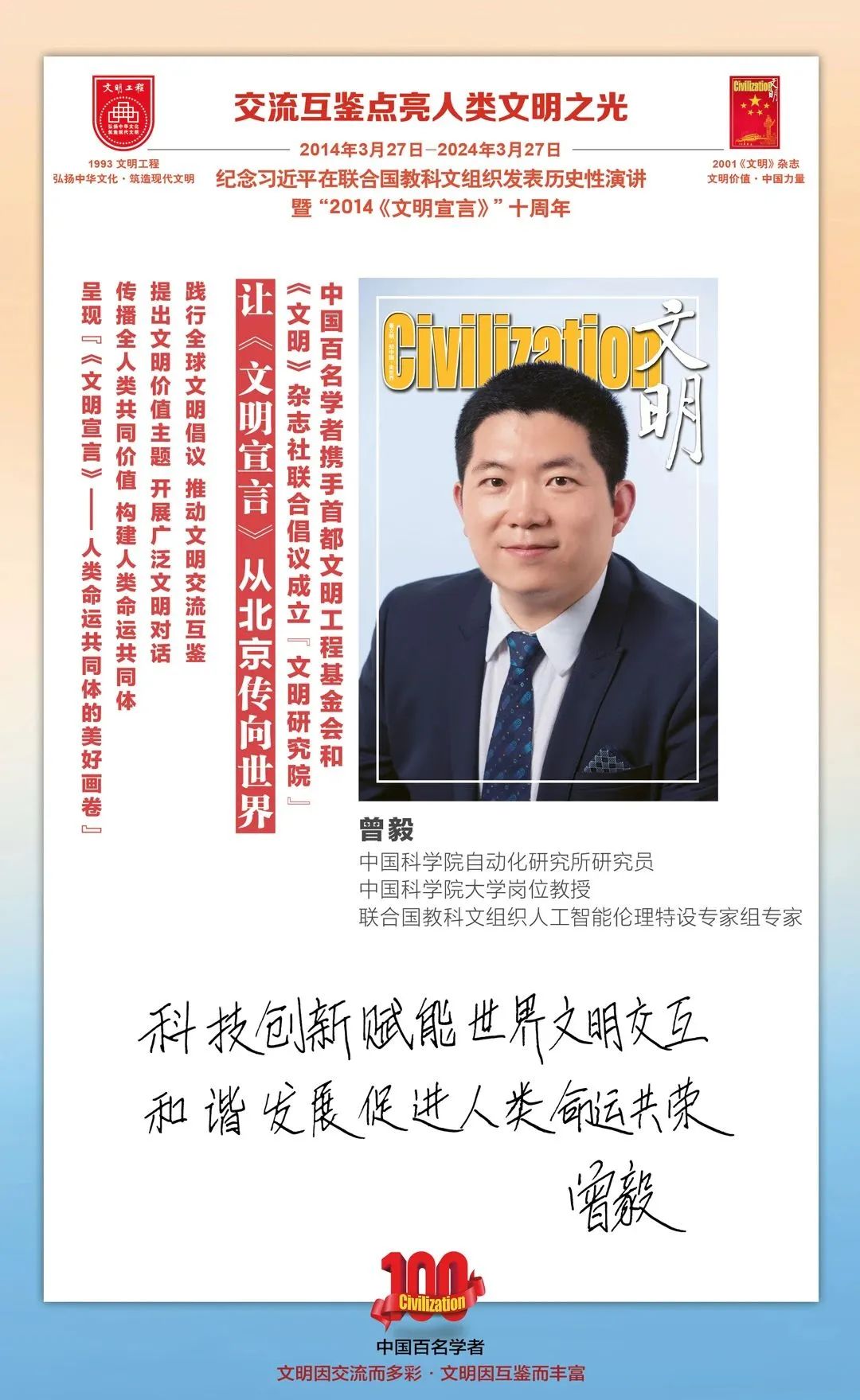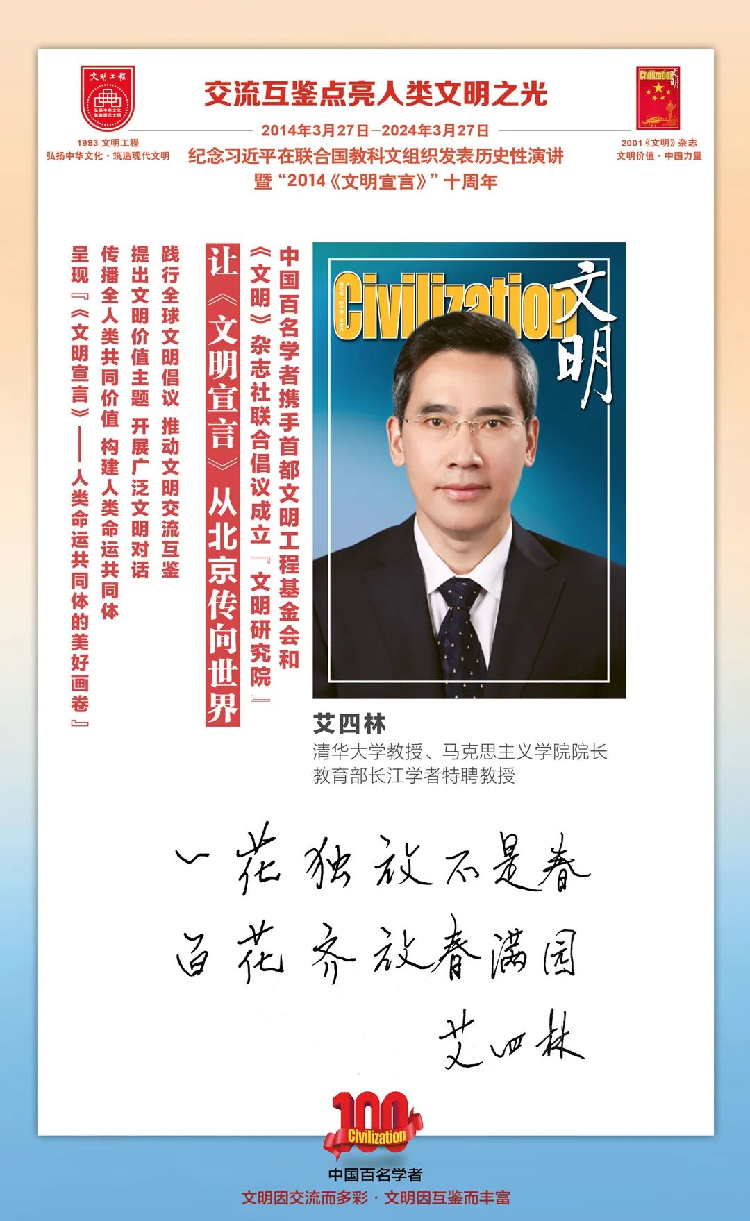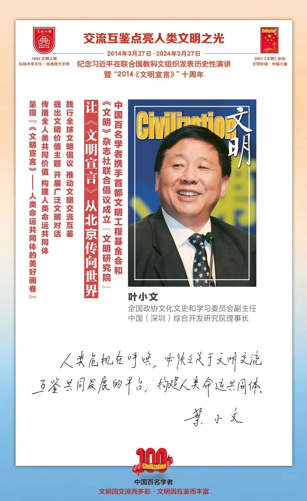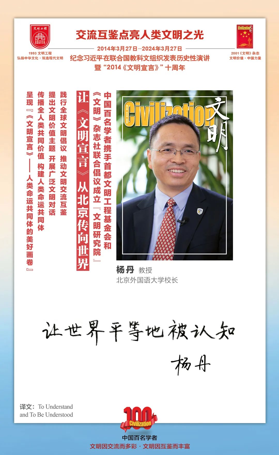 2014-2024,纪念2014《文明宣言》发表10周年,中国百名学者携手首都文明工程基金会和《文明》杂志社联合倡议。让《文明宣言》从北京传向世界,文明交流互鉴促进世界文明发展。
