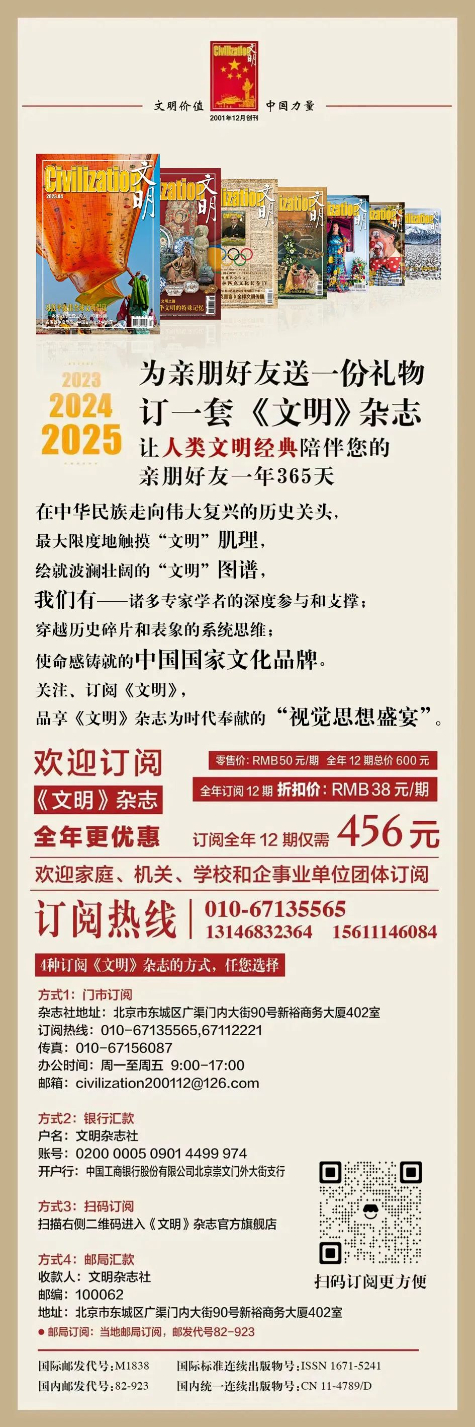从2014年《文明宣言》到2023年《全球文明倡议》,中国提出通过文明交流互鉴、加强文明对话和以全人类共同价值为基础构建人类命运共同体,这将是国际社会携手一起向未来的文明发展新方向。从2014年到2024年,《文明》始终致力于“开创世界各国人文交流、文化交融、民心相通新局面”,践行全球文明倡议,推动文明交流互鉴。因为只有尊重世界文明多样性、弘扬全人类共同价值、重视文明传承和创新以及加强国际人文交流合作,才能促进世界携手推动构建人类命运共同体,迈向实现人类命运共同体的美好新世界。