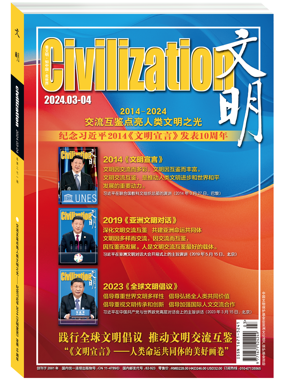 2024年3月27日,迎来“2014《文明宣言》”发表10周年纪念日,由中国文物保护基金会亚洲文化遗产保护基金支持、首都文明工程基金会和《文明》杂志社特别策划推出“《文明宣言》——人类命运共同体的美好画卷”专刊,践行全球文明倡议,推动文明交流互鉴。