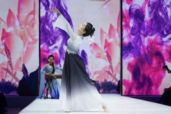 第二篇章:千年霓裳·华夏纹章。本篇章依据传世绘画、敦煌壁画、陶俑、史料记载等,由师生进行历代服饰形制再现演绎,以艺术再创激活传统美学。聚光灯照在T台中央:唐的华丽,大袖罗衫缀满手绘缠枝纹,浓烈的色彩对比,宽博的服饰形制,雍容华贵,流光溢彩;宋的清雅,褙子素雅如宋瓷,襕衫宽袖藏风骨,一针一线还原宋代服饰中的烟火人间;明的威仪,十二章纹、龙腾云霄、织金妆花……独特的服饰设计美学带来强大的视觉冲击。