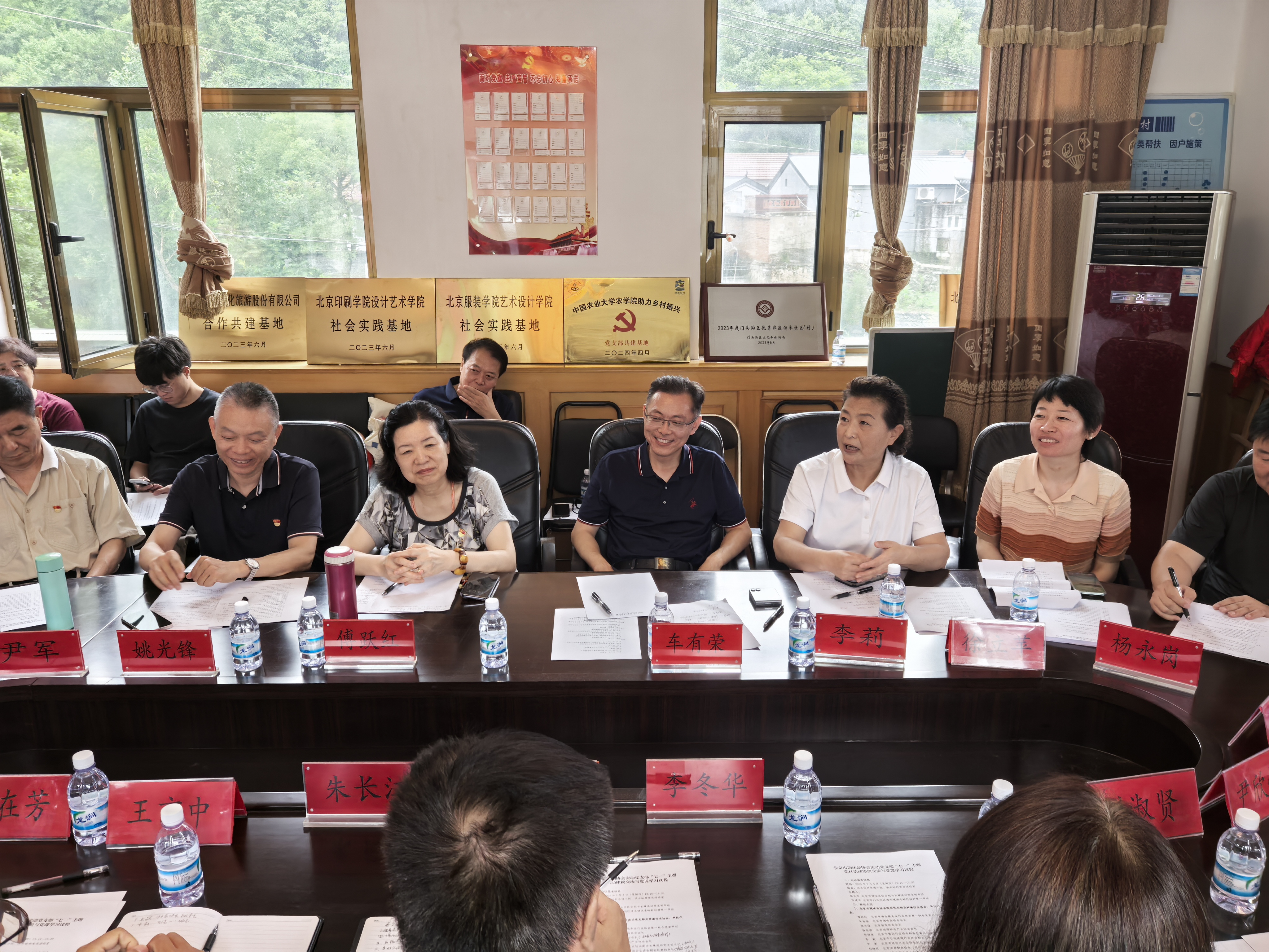 深入洪水峪村,代表团重点考察非遗小院保护现状与产业瓶颈,精准把脉发展需求。实地调研后,一场高效务实的座谈在村党员活动室举行。清水镇党委委员李冬华首先代表镇党委、政府致欢迎辞,对代表团深入深山区助力振兴表示感谢,并介绍了清水镇及洪水峪村在党建引领下的乡村振兴成果与发展诉求。随后,多家协会联合倡议开发融合洪水峪非遗元素的“联名文创产品”,并探讨乡村旅游推介、农产品展销、人才培训等多元合作。北京市调味品协会会长车有荣提出共建“社会大课堂基地”,推动乡村资源转化为研学实践平台。