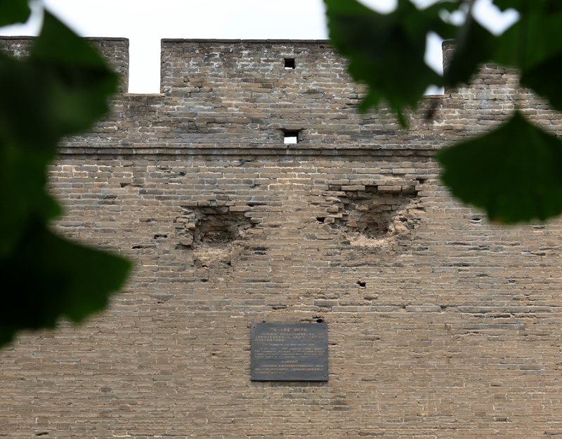 这是7月4日拍摄的宛平城城墙上的弹坑遗迹。