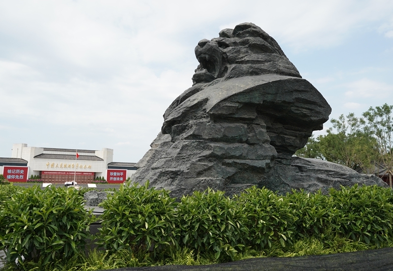 这是7月7日在中国人民抗日战争纪念馆前拍摄的醒狮雕塑。