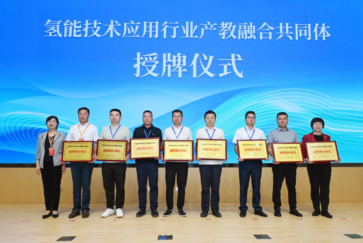 启动仪式上,与会领导共同点亮启动球,宣布氢能技术应用行业产教融合共同体正式成立。大会公布了共同体理事会成员单位名单,并为理事长单位、副理事长单位授牌。