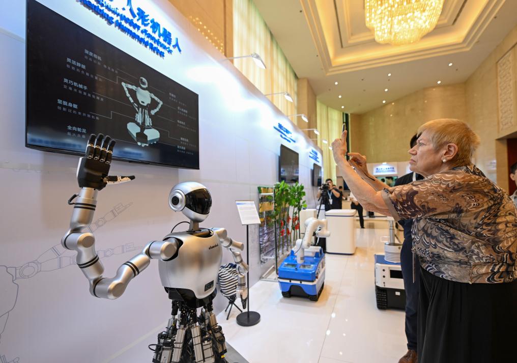 7月11日,参会嘉宾在2025上合组织数字经济论坛互动体验区与参展企业工作人员交流。新华社记者 孙凡越 摄