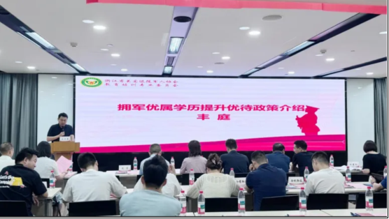 浙江省关爱退役军人协会教育培训专委会秘书长丰庭作拥军优属学历提升优待政策解读,通过享受费用减免(优惠2000元到费用全免)、提供助学服务、给予就业指导,力求给余杭区广大现役军人、退役军人、退役军人事务工作人员及其亲属提供更好的学历提升机会和体验。