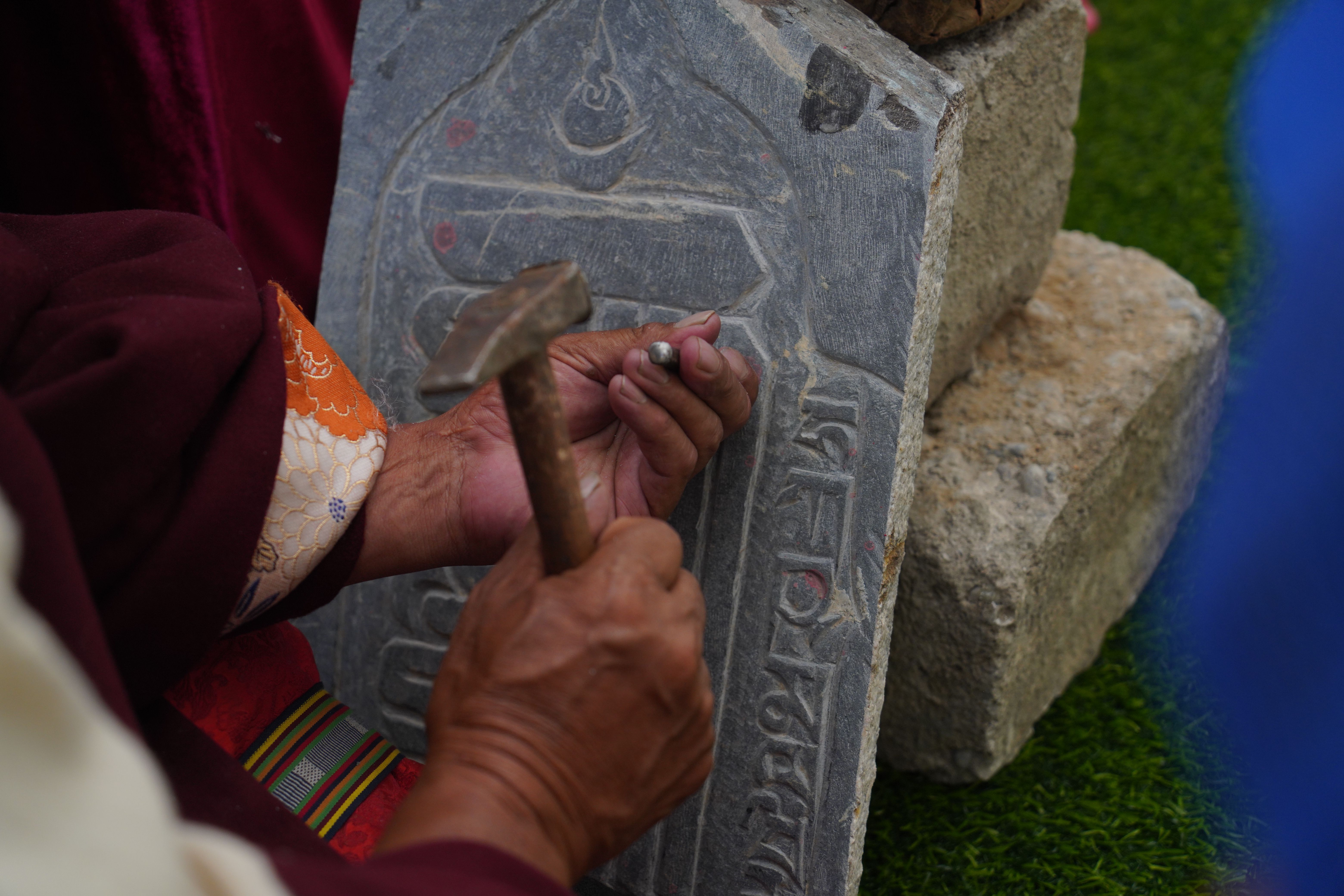 ▲“非遗赋能 匠心传承”活动现场,扎西顿珠展示雕刻制作技艺。中国网记者胡俊 摄