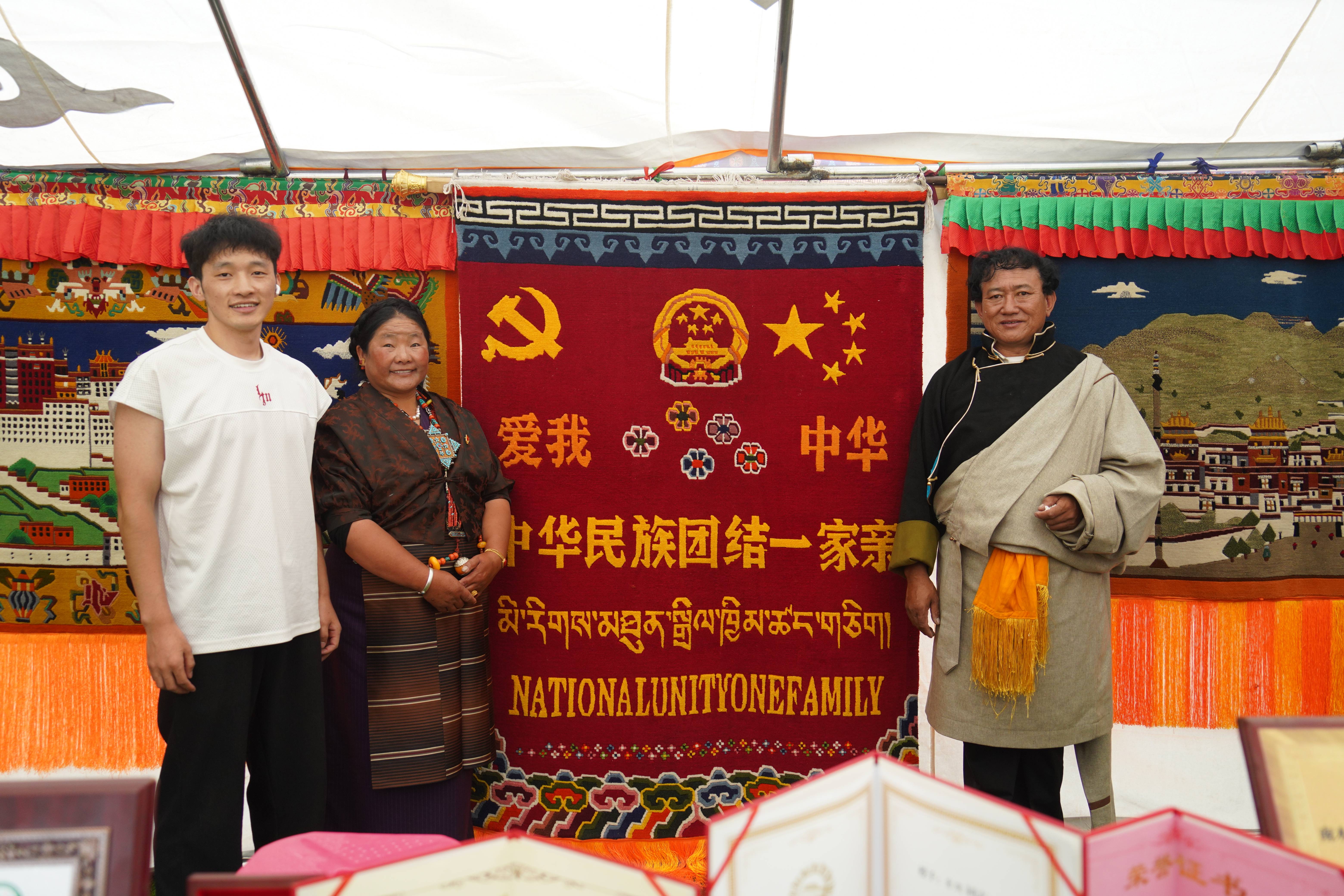 西藏自治区第六届劳动模范、南木林县孔朗朗巴纺织农牧民合作社负责人索朗携家人也来到了“非遗赋能 匠心传承”展示现场。为庆祝西藏自治区成立60周年,索朗一家特意设计制作了一幅藏毯——底部34个波浪代表34个省市自治区,56朵花代表56个民族,顶部纹饰象征长城……