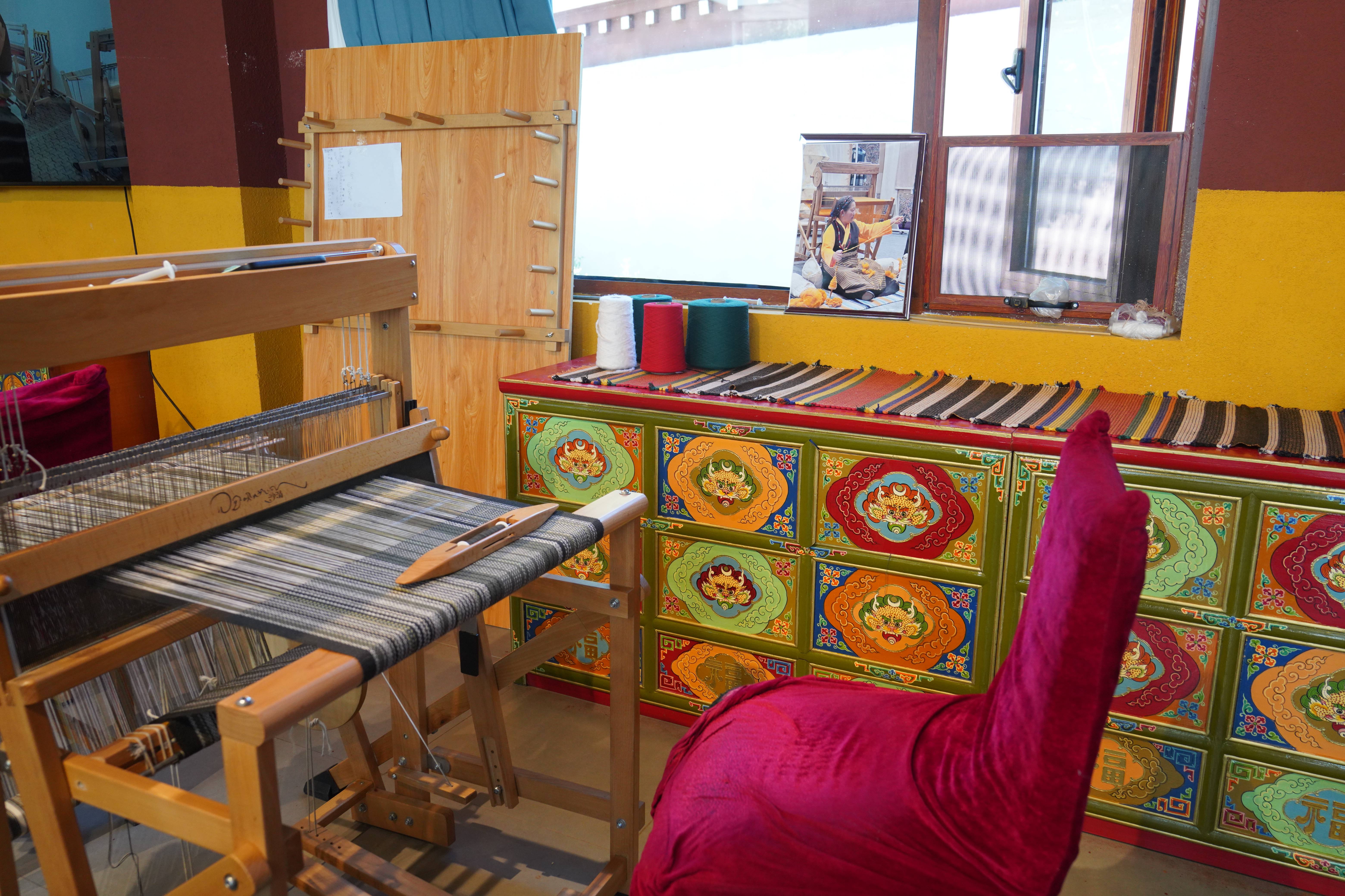 ▲“阿佳格桑工坊”里制作氆氇的工位以及木质纺织机。中国网记者 胡俊 摄