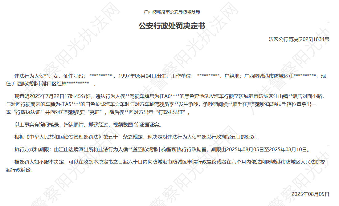 中新网8月6日电 据八桂警察阳光执法网网站消息,8月5日,广西防城港市公安局防城分局发布公安行政处罚决定书: