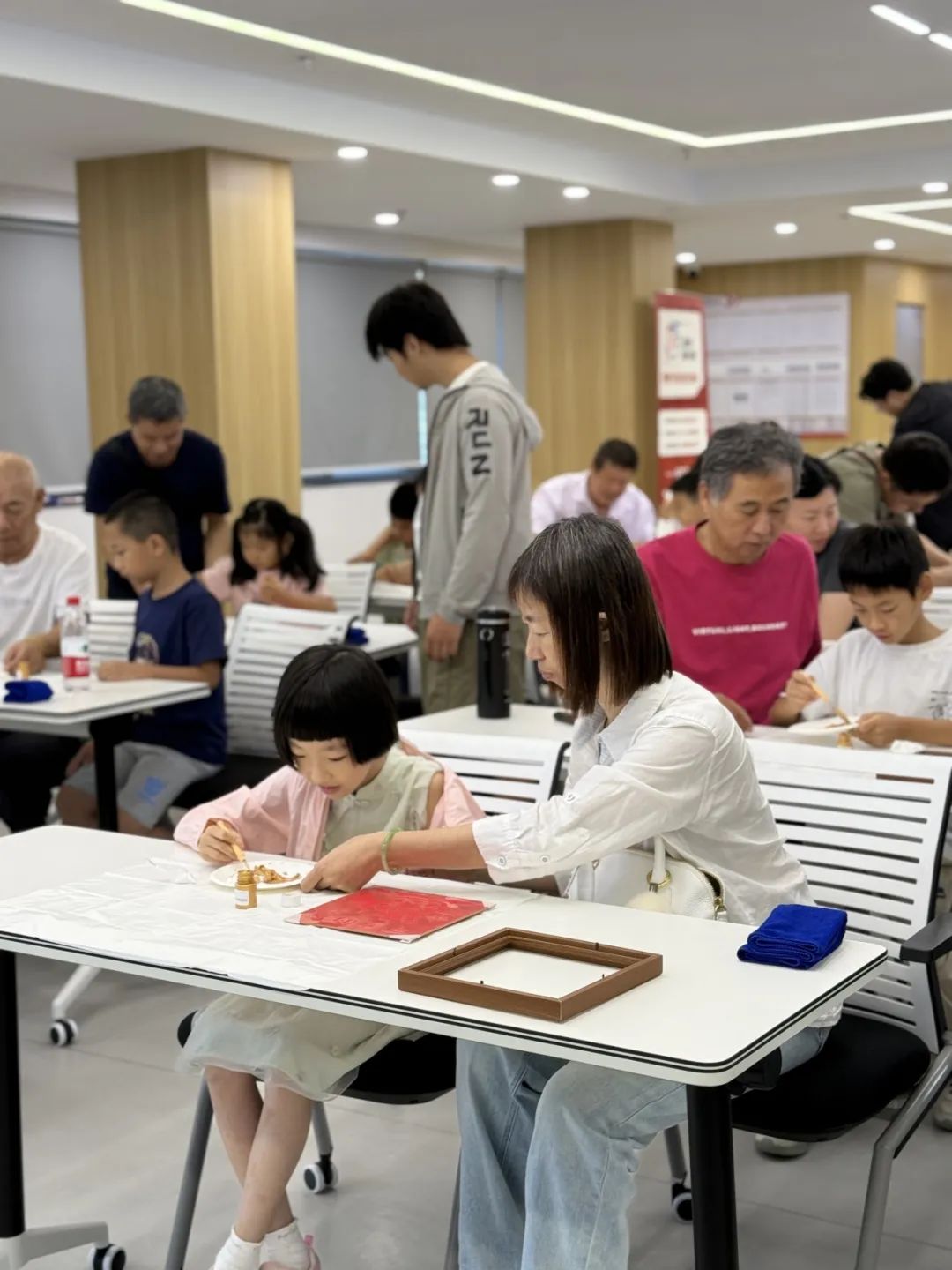 为让红色教育更具温度与趣味,活动特别设计了“八一”主题亲子拓印体验。家长与孩子携手在红纸上拓印出“致敬军人”“强国有我”等滚烫标语,以及英姿飒爽的解放军剪影。当非遗技艺遇上红色主题,不仅飘着传统文化的韵味,更传递出“父辈守护家国、我辈接续传承”的厚重力量,不少家长感慨:“这样的体验,让孩子对‘英雄’有了更具体的认知。”