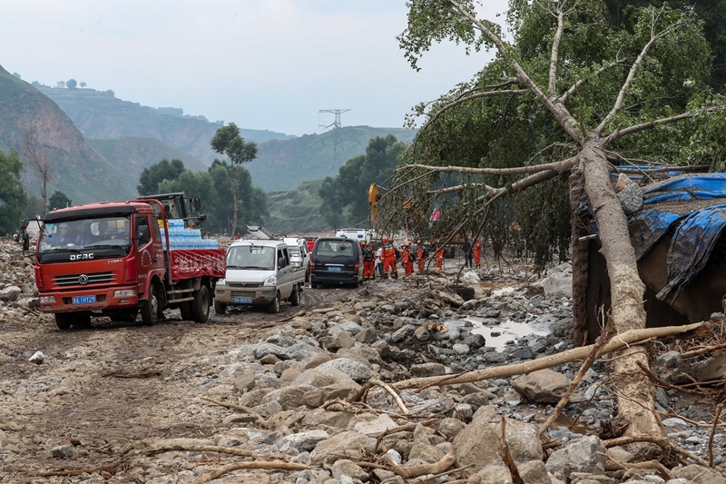 8月9日,在榆中县马坡乡马莲滩村,救灾车辆行驶在路上。
