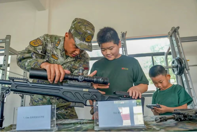 武器展示区,自动步枪、狙击枪、手枪、冲锋枪等各类枪支一字排开,瞬间点燃军娃的“军魂”!班长拆解枪械时,零件在掌心飞速流转,“咔嗒”归位的声音让小军迷们疯狂“爆灯”:“这比‘吃鸡’装备帅100倍!”
