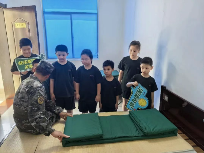 班长演示叠被“神功”:捏线、抠角、压边,软被子瞬间有了“钢铁棱角”。军娃们上手挑战“叠被大业”,把被子折腾成“面包”“油条”,却在班长的耐心指导下,慢慢捏出了“雏形”。孩童指尖折出的棱角,是未来人生的脊梁。