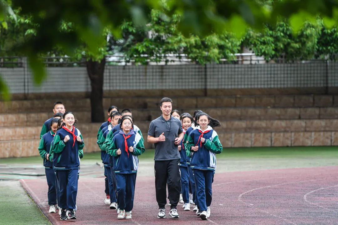“手臂摆动再大一点!保持节奏,最后一圈!”暑假前的最后一堂课,“兵教师”冯廷飞正专注地指导学生训练。