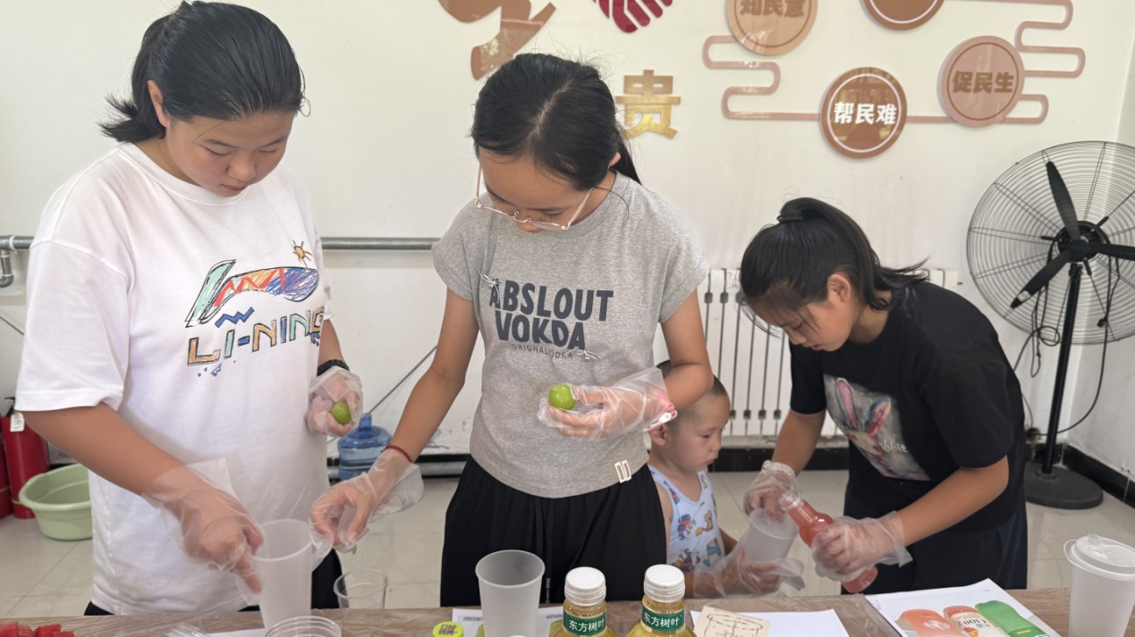活动现场,摆满了雪碧、养乐多、绿茶等饮品,以及葡萄、柠檬、百香果等新鲜水果。工作人员首先提醒大家做好手部清洁,随后详细讲解消暑饮品的制作步骤。在工作人员的耐心指导下,孩子们认真搭配食材、调试口味,不一会儿,一杯杯冰凉爽口的饮品便制作完成,空气中满是清甜气息。