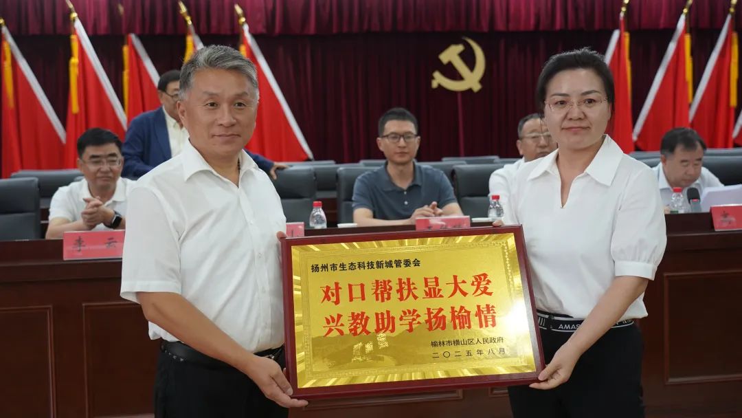 本次优秀困难大学新生慈善资助金发放仪式上,聂祥代表扬州市生态科技新城管委会向区慈善协会会长臧明山递交了捐赠牌,吴瑕向扬州市生态科技新城管委会颁发了感谢牌。宣读了《榆林市横山区慈善协会关于2025年资助优秀困难大学新生的决定》,并向受助学生代表颁发了资助金牌和资助证书。受助学生举行了集体宣誓仪式。(横山区委宣传部供稿)