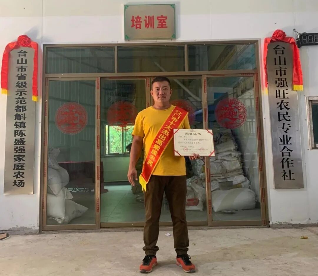 这份扎根乡土的坚守与担当,为陈盛强及家庭农场赢得了各级认可:个人先后获评台山市转复退军人“勤劳致富”先进个人、中国绿业元集团“农业科技带头人”(2018年)、“2020年广东省农村乡土专家”、“2021年广东省农机使用一线土专家”、“新农协杯”2021年度江门市十大杰出高素质农民、2023年台山市“最美新乡贤”、2024年江门市“优秀共产党员”;家庭农场获评广东省、江门市、台山市、都斛镇四级“示范家庭农场”,2021年其家庭更获“最美退役军人家庭”“最美军人家庭”双重荣誉,2024年5月又摘得广东省“标杆家庭农场”殊荣。