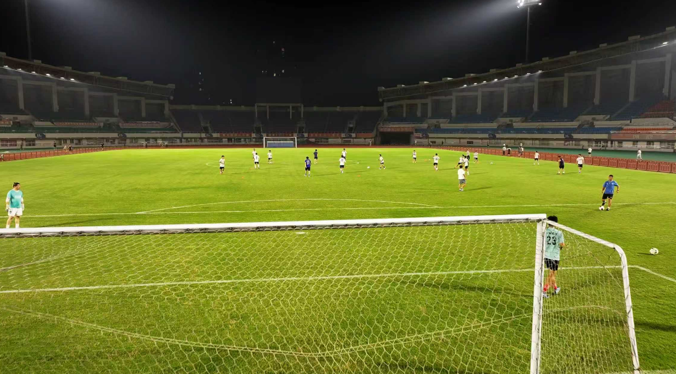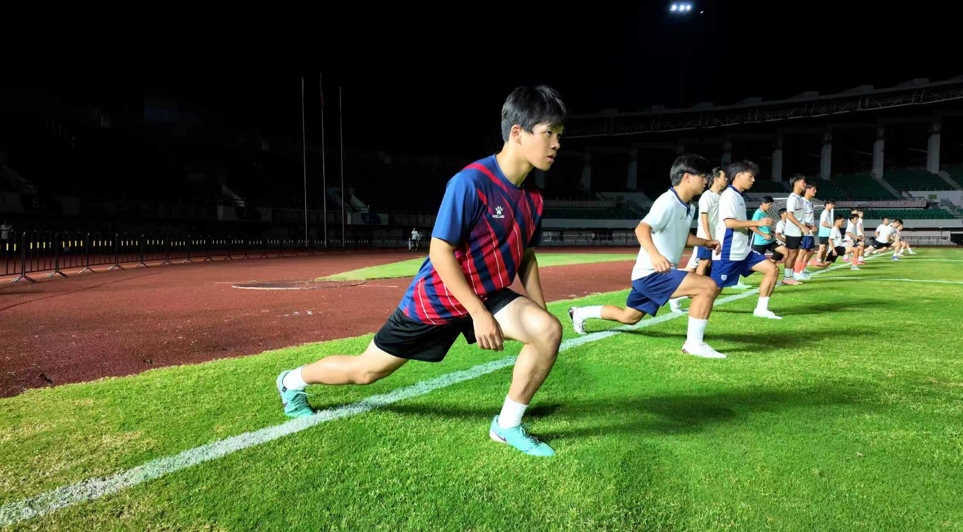 9月15日晚7点,足球场已亮起灯光,大足石刻队的队员们陆续到场,迅速进入训练状态,慢跑热身、分组传接球,运动员练得认真,教练则在一旁仔细观察,不时上前纠正队员的传球力度与跑位路线。