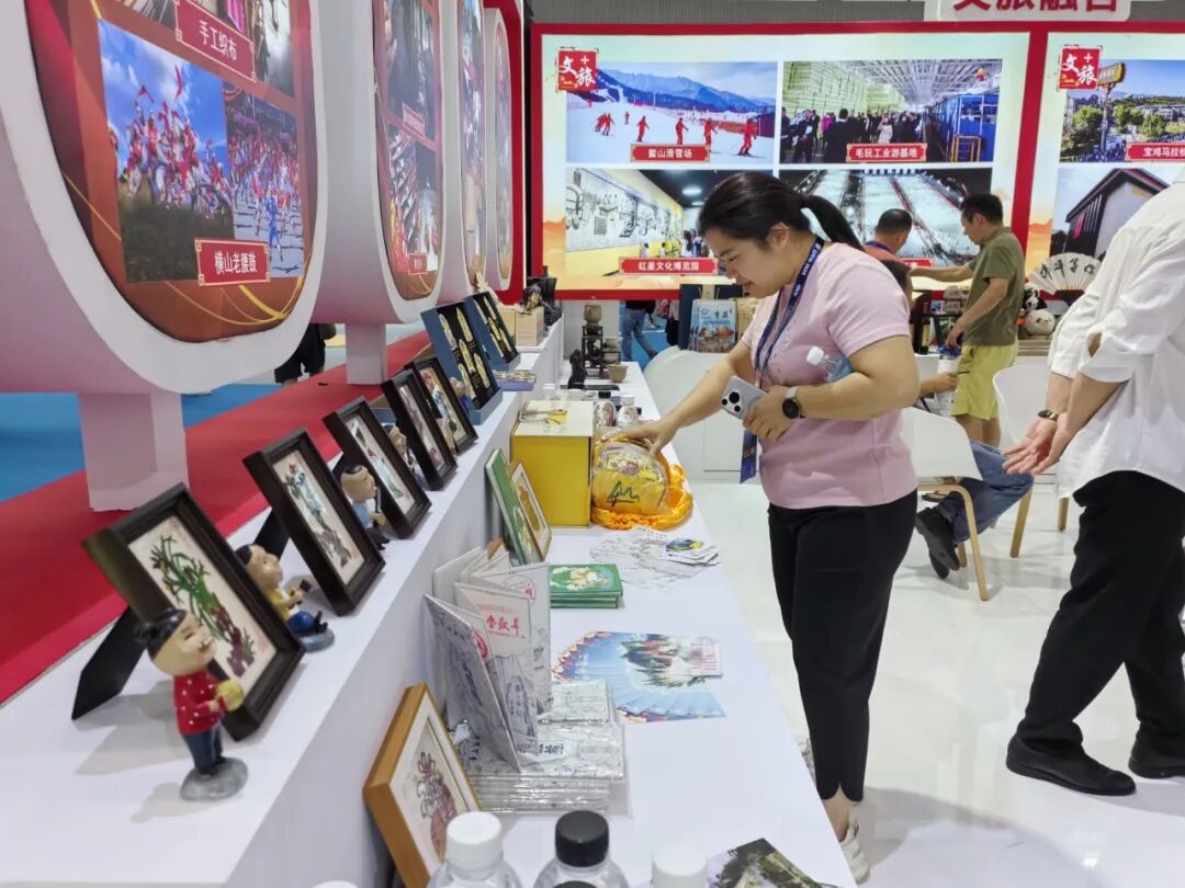 陕西展馆,华山景区展台上,丰富多样的华山系列文创产品,吸引了大量参观者驻足欣赏。极具华山特色的梦仙枕、非遗老腔人偶、华山玉井莲瓶装水、皮影摆件、武侠人偶、纪念币、桃木剑、冰箱贴等文创商品参加了展销宣传。