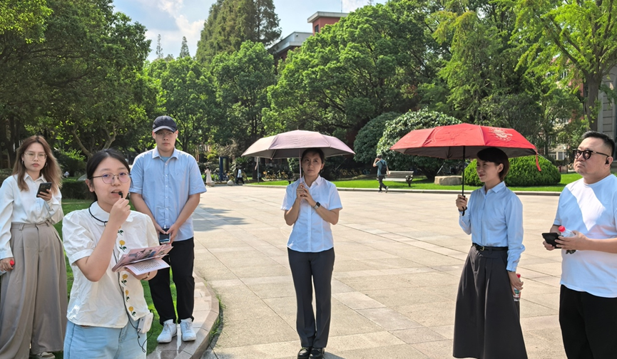 活动伊始,复旦红色讲解员带领英烈故事团成员沿复旦校园红色地标开展实地研学。从逸夫科技楼、华东人民革命大学旧址,到相辉堂、镌刻52位复旦烈士的烈士广场,每一处建筑都是鲜活的“红色课堂”。讲解员以详实史料和生动叙事,串联起复旦校史与中国革命史的联系,让成员们在行走中感悟复旦“爱国、奉献、团结、奋斗”的精神内核。研学后,成员们感慨道,这场学习让红色记忆从文字走向现实,更添厚重感。