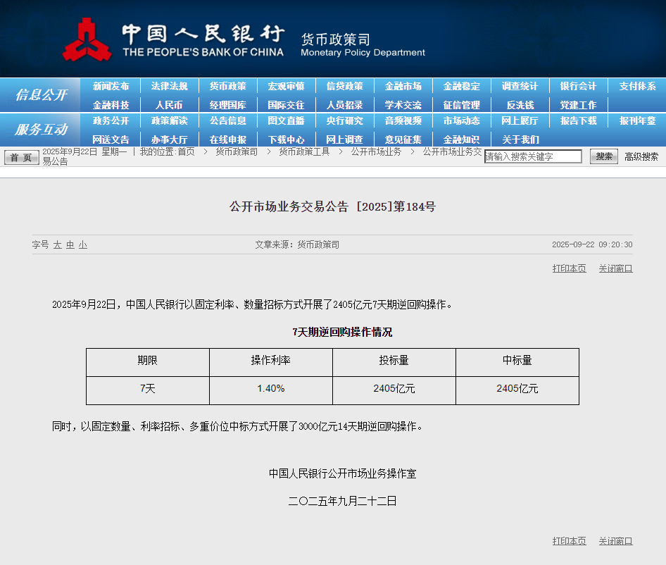 人民网北京9月22日电 (记者罗知之)据中国人民银行网站消息,中国人民银行今日以固定利率、数量招标方式开展了2405亿元7天期逆回购操作。同时,以固定数量、利率招标、多重价位中标方式开展了3000亿元14天期逆回购操作。