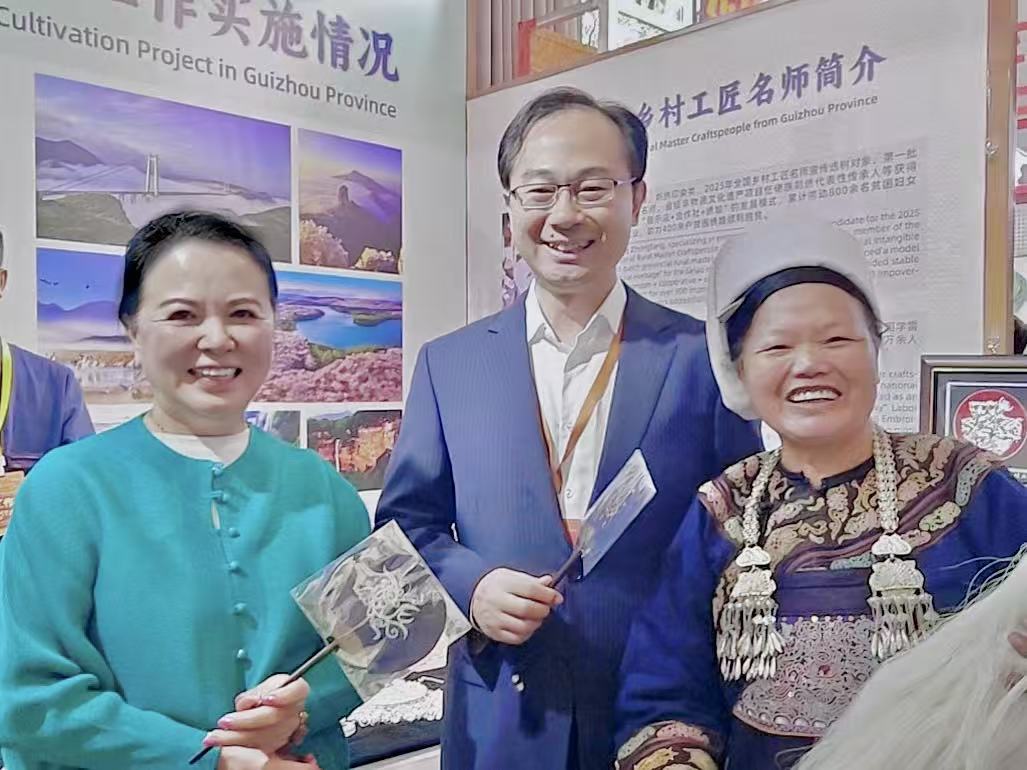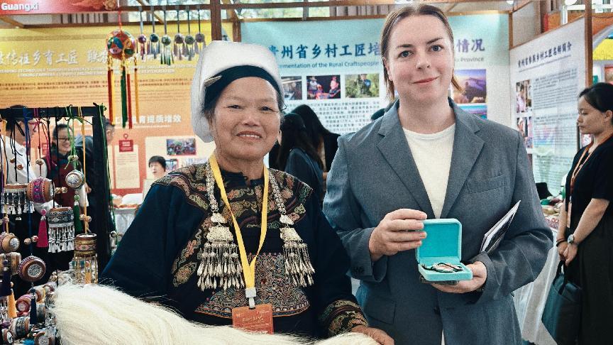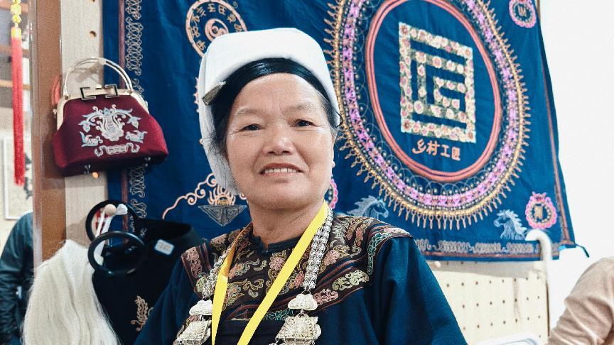 北京农展馆丰收节贵州展区内,水族马尾绣,在英国媒体镜头下,两位东方女性的手紧紧相握。十年前的相遇,如今已结出累累硕果。