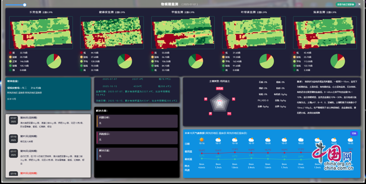 在农资服务领域,其“家庭联合”产品解决了传统农技服务“视角受限”问题。“农户地里出问题先找农资店,但人站田间只能看200-300米,50亩地中间情况看不见。”疆天科技总经理助理周皓举例,通过卫星遥感,能快速识别地块哪处长势差、原因是什么,“农技人员不用跑遍所有地,坐办公室就能摸清5万、10万亩地情况,重点服务问题区域,效率翻番”,目前已服务全疆多家头部农资企业及数百个农资店。