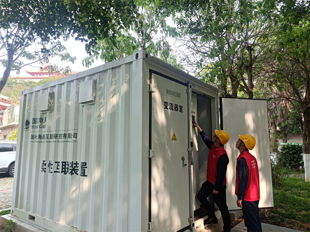 国网湄洲岛供电公司员工查看柔性互联装置运行情况。(朱玉森 摄)