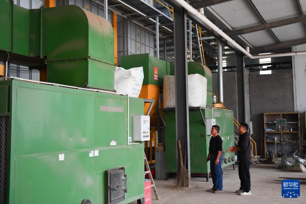 10月29日,邱彬(右)和父亲邱国清在查看烘干机运行情况。新华社记者 陈振海 摄