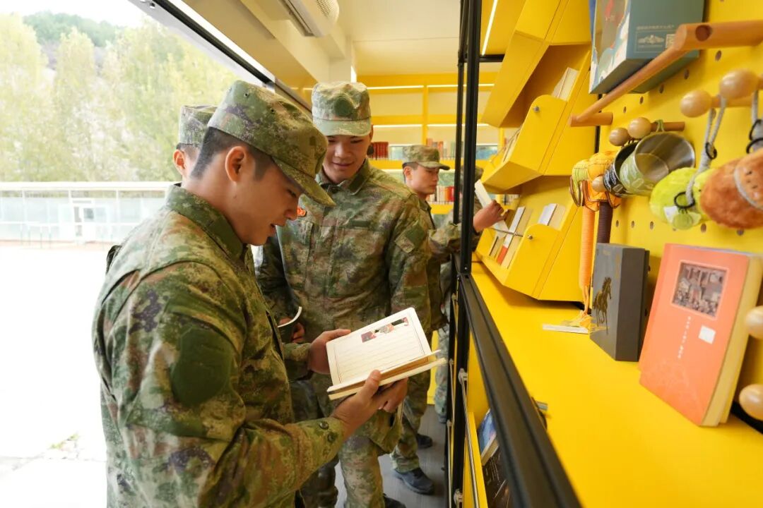 一辆满载图书的“移动悦读馆”缓缓驶入军营,车内精心布置的文创架、阅读区和琳琅满目的书籍,瞬间成为官兵们争相打卡的“文化驿站”。