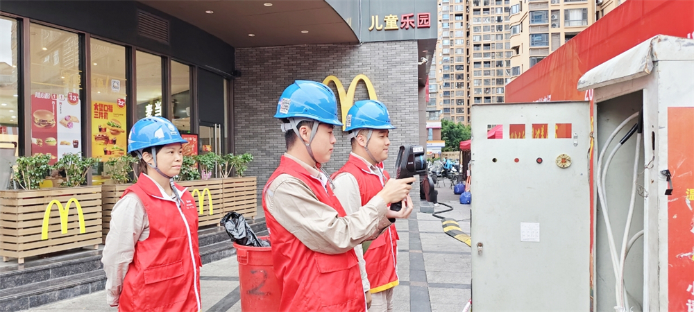 为确保万无一失,武安供电所提前部署,成立由党员骨干牵头的保电专班,开展“地毯式”隐患排查。服务队员身着红马甲,携带红外测温仪、钳形电流表等专业设备,对环网柜、临时舞台配电箱、商户用电接口、景观照明线路及临时供电设施等关键节点进行“拉网式”诊断,重点监测线路负载率、接头温升及漏电保护装置运行状态,累计排查隐患8处,现场整改5处,其余均建立台账闭环管理。