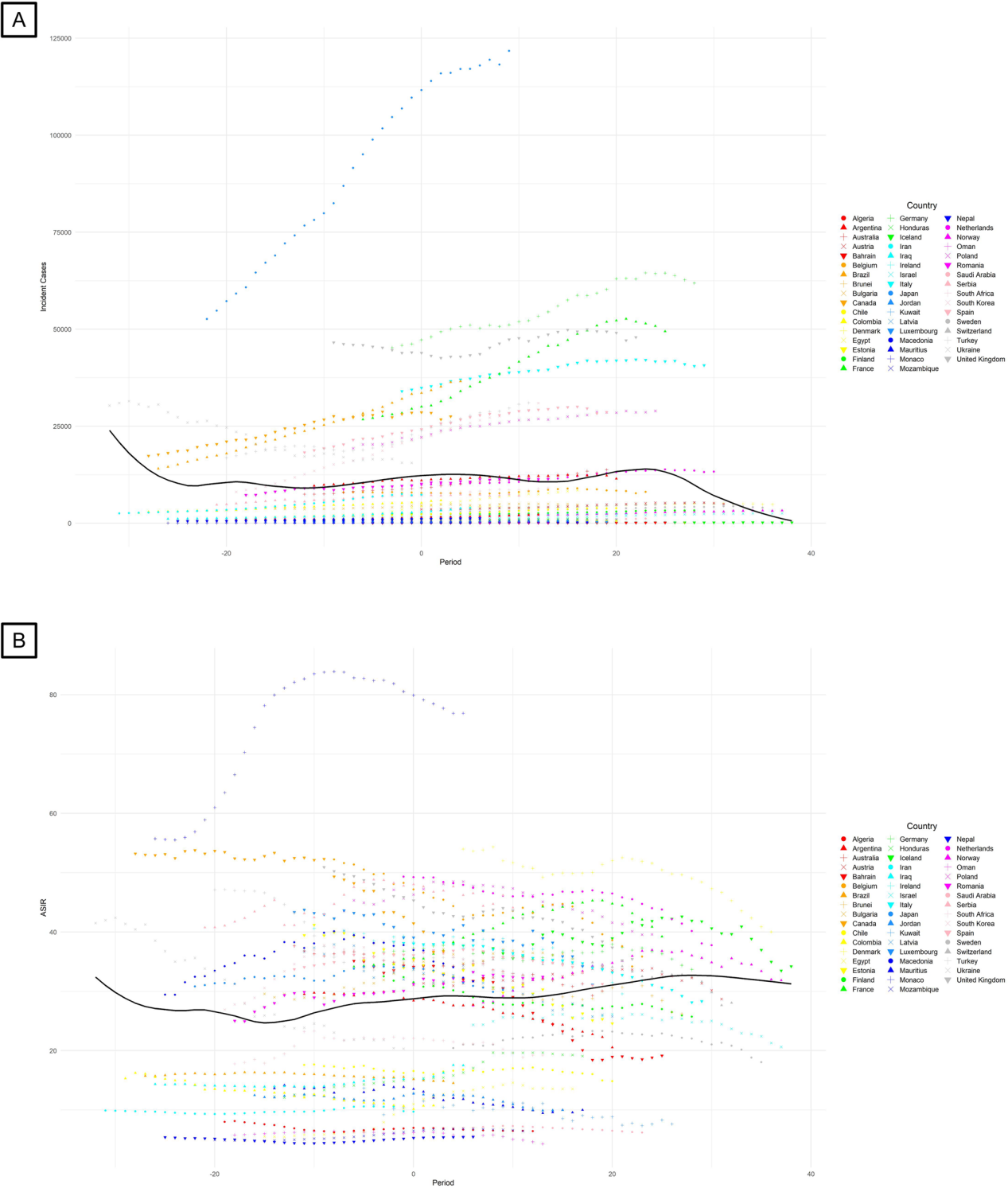 ▲全面禁止石棉后肺癌新发病例数(A)和年龄标准化发病率(B)的时间趋势
