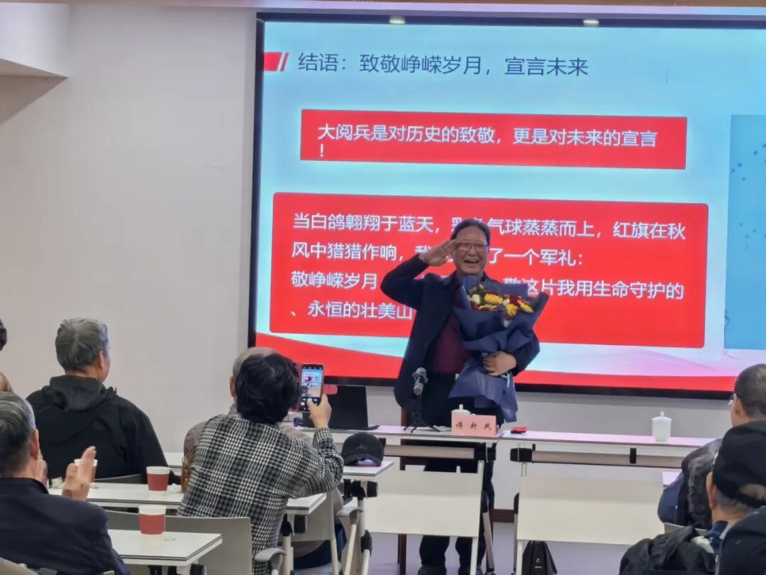10月23日,徐汇军休中心一分所内座无虚席,50余位军休干部齐聚一堂,聆听宣讲员傅新民带来的专题党课《大国担当——从阅兵看中国力量》。这堂课以“9·3”阅兵式为切入点,结合历史影像与鲜活案例,从装备升级、方阵编成、国际影响等维度展开深度解读。课后,军休干部们自发组织讨论,纷纷表示要“讲好军旅故事,传承红色薪火”,以实际行动为社会治理、关心下一代工作贡献余热。