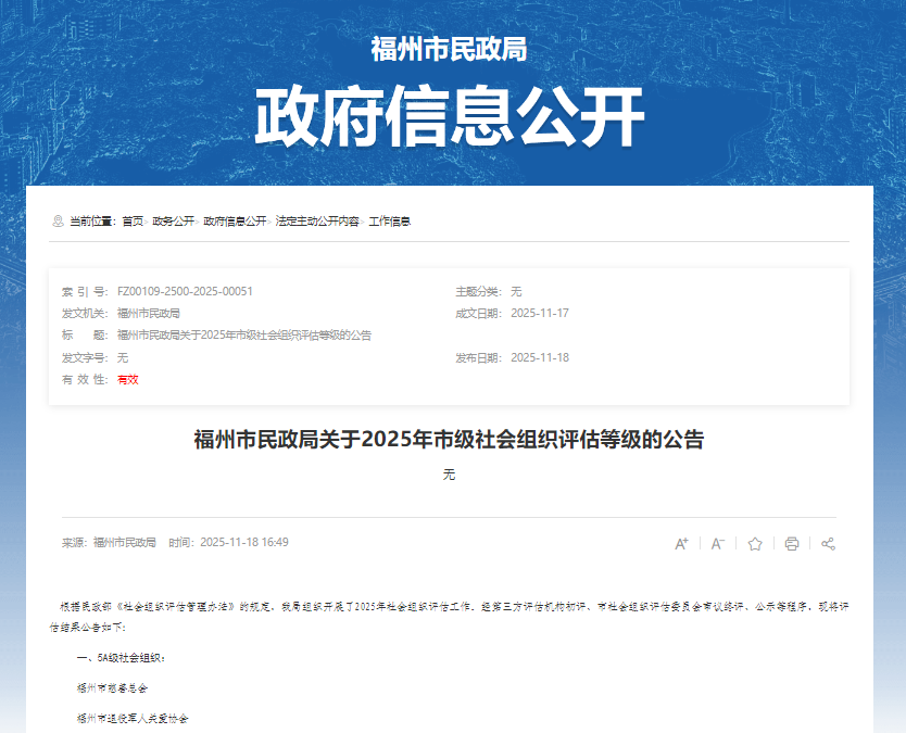 近日,福州市民政局发布2025年市级社会组织评估等级公告。经第三方评估机构初评、市社会组织评估委员会审议终评、公示等程序,福州市退役军人关爱协会等6家社会组织获评5A级!