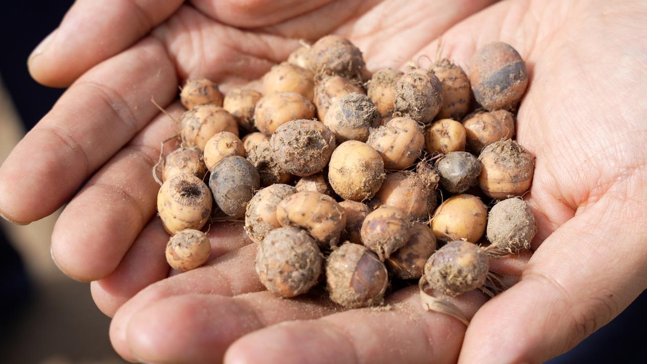 三师五十四团兴安镇曾是“种植禁区”:沙地里的有机质含量不足0.1g每公斤,年遇30多场7级大风。2017年试种,2019年开始规模化种植油莎豆,让沙漠变绿洲。