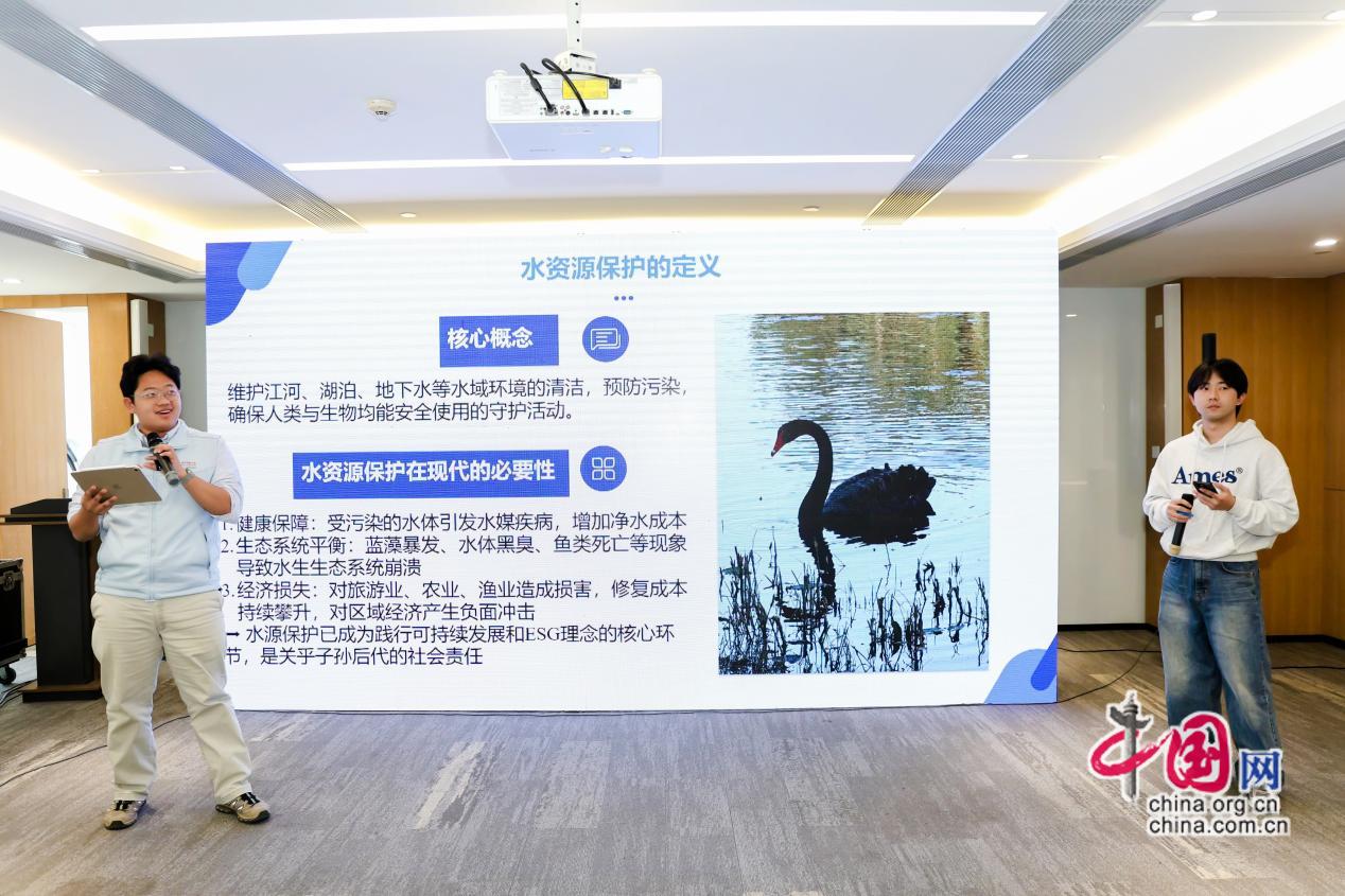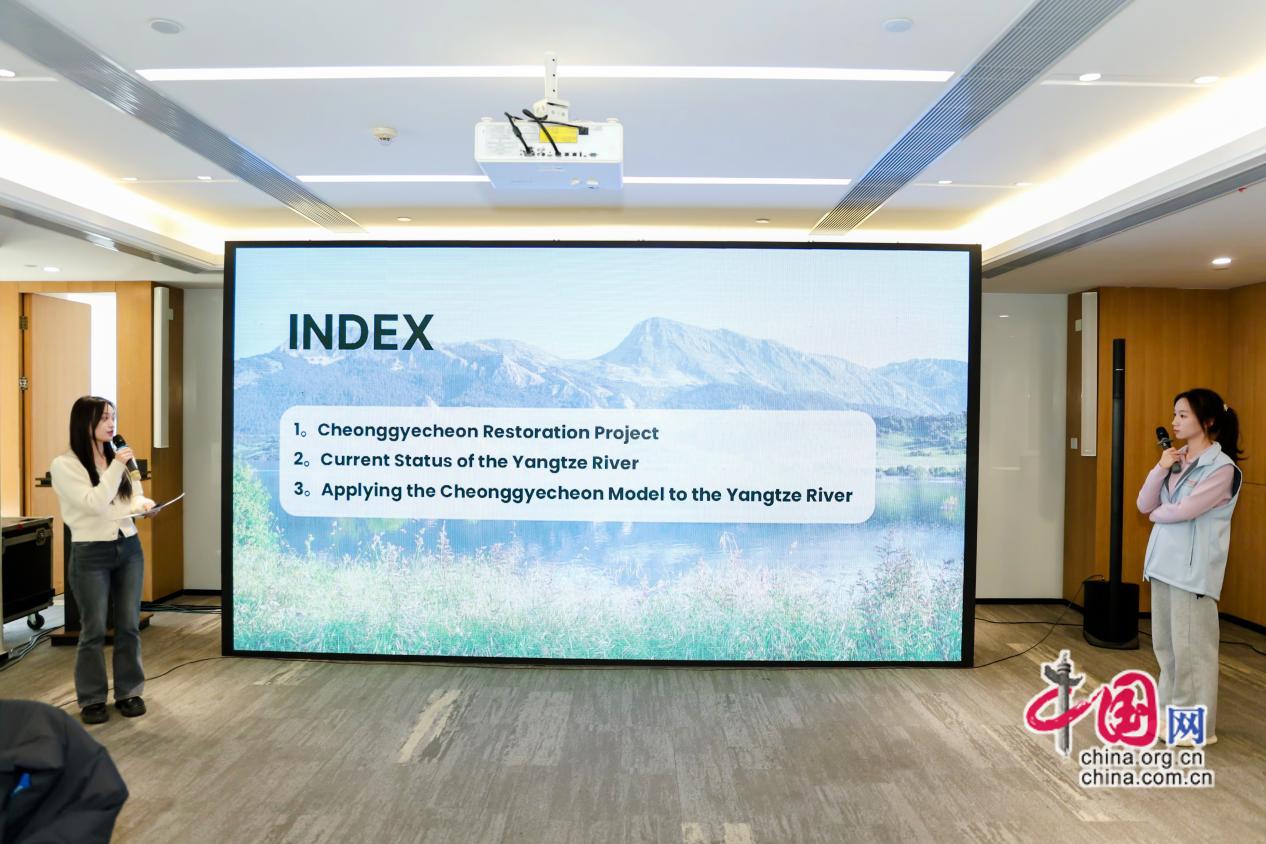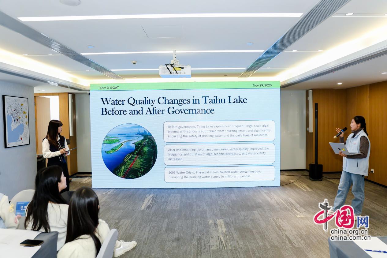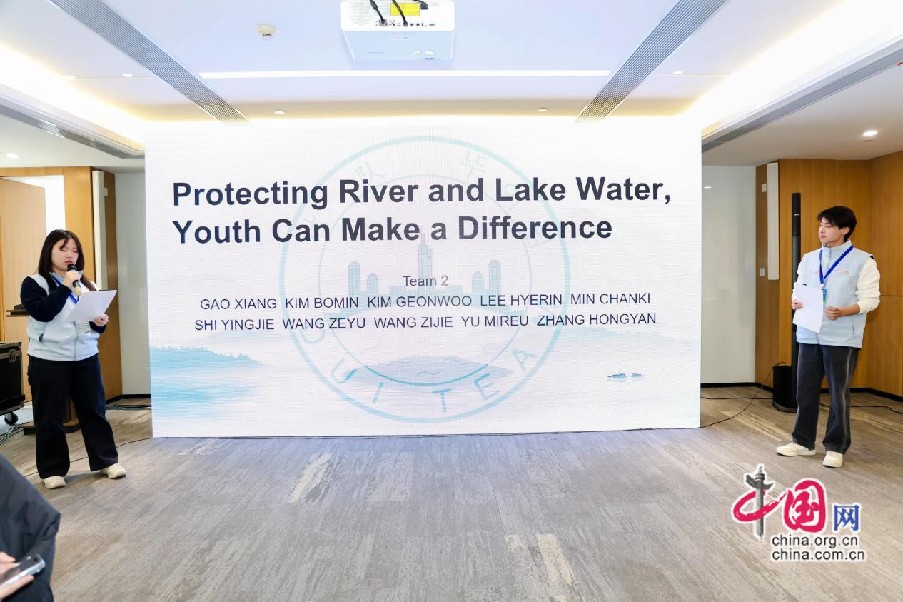 成果汇报环节亮点纷呈。内蒙古分团中方营员柯锦辉、韩方营员刘宙美,海南分团中方营员郝鹏宇、韩方营员姜民锡,分别分享了在荒漠生态修复、热带雨林保护中的实践感悟与跨文化协作收获。江苏分团五组营员依次登台,中韩青年围绕“韩国清溪川修复模式对长江治理的启示”“中韩湖泊富营养化治理技术对比”“太湖蓝藻防控与汉江生态复兴经验互鉴”等核心议题展开汇报,展现了中韩青年们对区域生态保护的深度思考与中韩治理经验的交流融合。