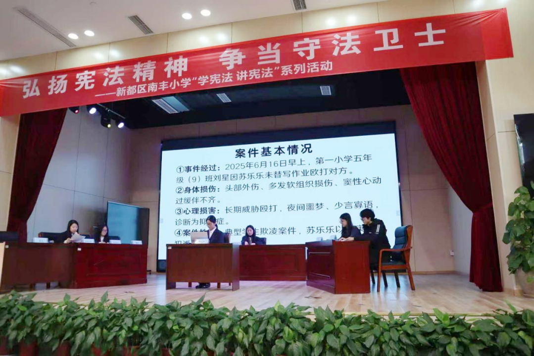 11月27日,成都市新都区司法局联合西南石油大学法学院先后走进大丰街道石犀小学、南丰小学开展反校园霸凌主题模拟法庭,两所学校共1000余名学生参加。
