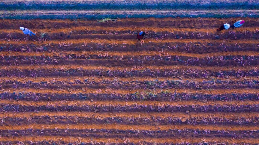 在子洲县何家集镇红太有机蔬菜种植基地,村民们正在采收红薯、马铃薯。