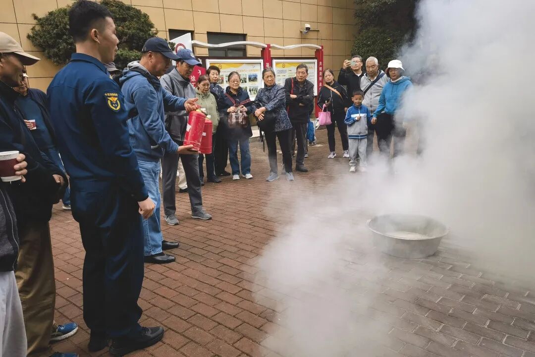 课堂结束后,在教官的专业指导下,军休干部和社区居民分组进行灭火器实操演练,大家按照“提、拔、握、压”的操作要领逐一上手实践,教官则在旁实时纠正动作偏差,确保每位参与者都能掌握正确使用方法,进一步强化了应急处置的实战能力。