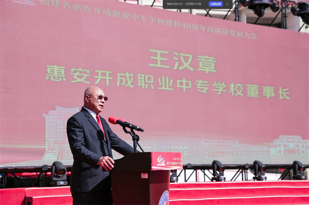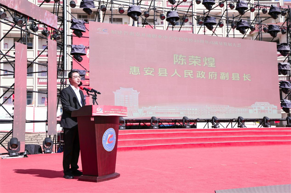 惠安县人民政府副县长陈荣煌在讲话中代表县委、县政府向开成职校建校40周年表示热烈祝贺。他指出,县委、县政府始终把职业教育摆在战略位置,累计投入2.46亿元支持学校建设。他希望开成职校紧抓“产业强县”机遇,优化专业布局,培育更多“名学生”,争当县域职业教育高质量发展的排头兵。