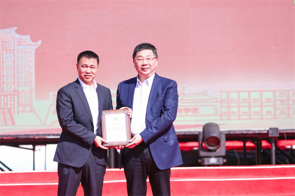 大会对在校任教满30年及以上的9名教职工给予通报表扬并颁发荣誉证书,同时对长期慷慨捐资支持学校发展的个人及校友团体代表,予以表扬授牌。其中,91届校友、校友总会会长、惠安县政协副主席、福建莲花集团董事长陈照玉自2015年以来累计向母校捐赠1170万元,惠安县委常委、宣传部部长刘东升为其颁发“杰出贡献奖”。