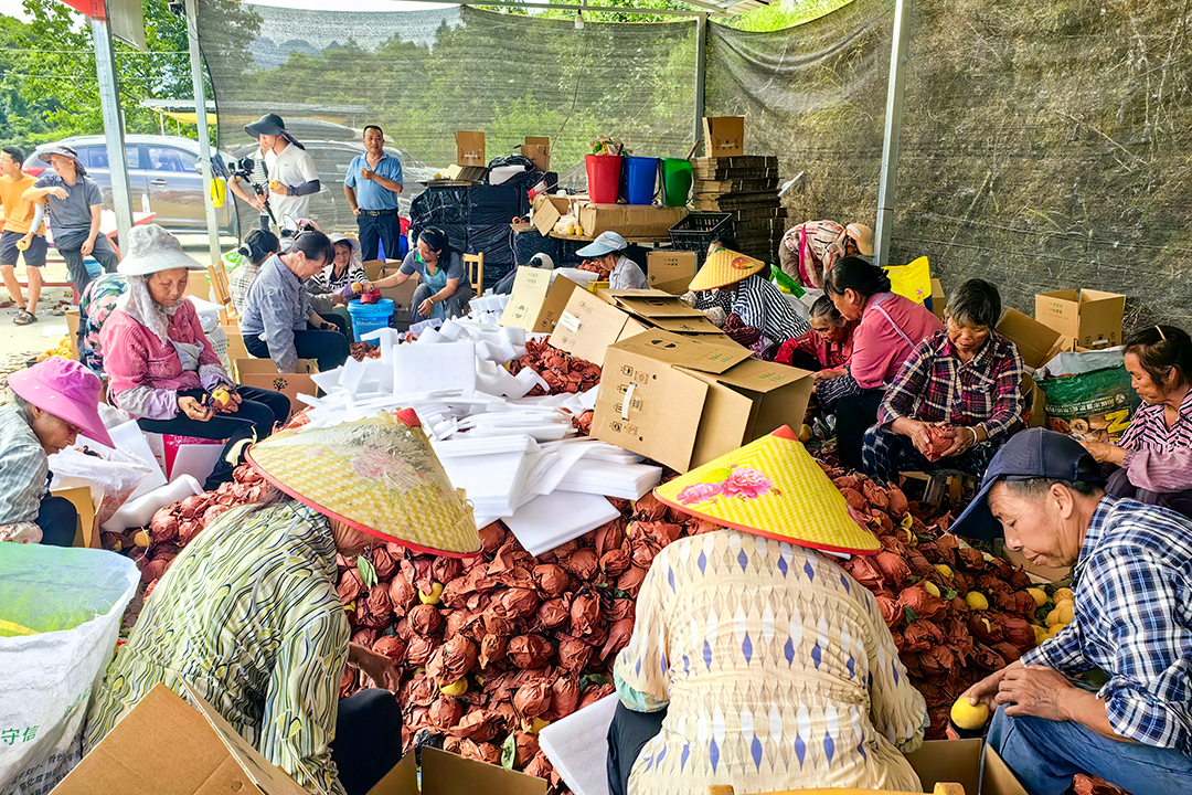 走进老兵庄园黄桃集中分拣点,30多名务工群众正有条不紊地分拣、装箱、打包、装车……这批20吨价值14万元的黄桃即将发往广州市白云区。自去年起,在黄丝村村支两委的牵线搭桥下搭建起了这条“点对点”对外销售线。